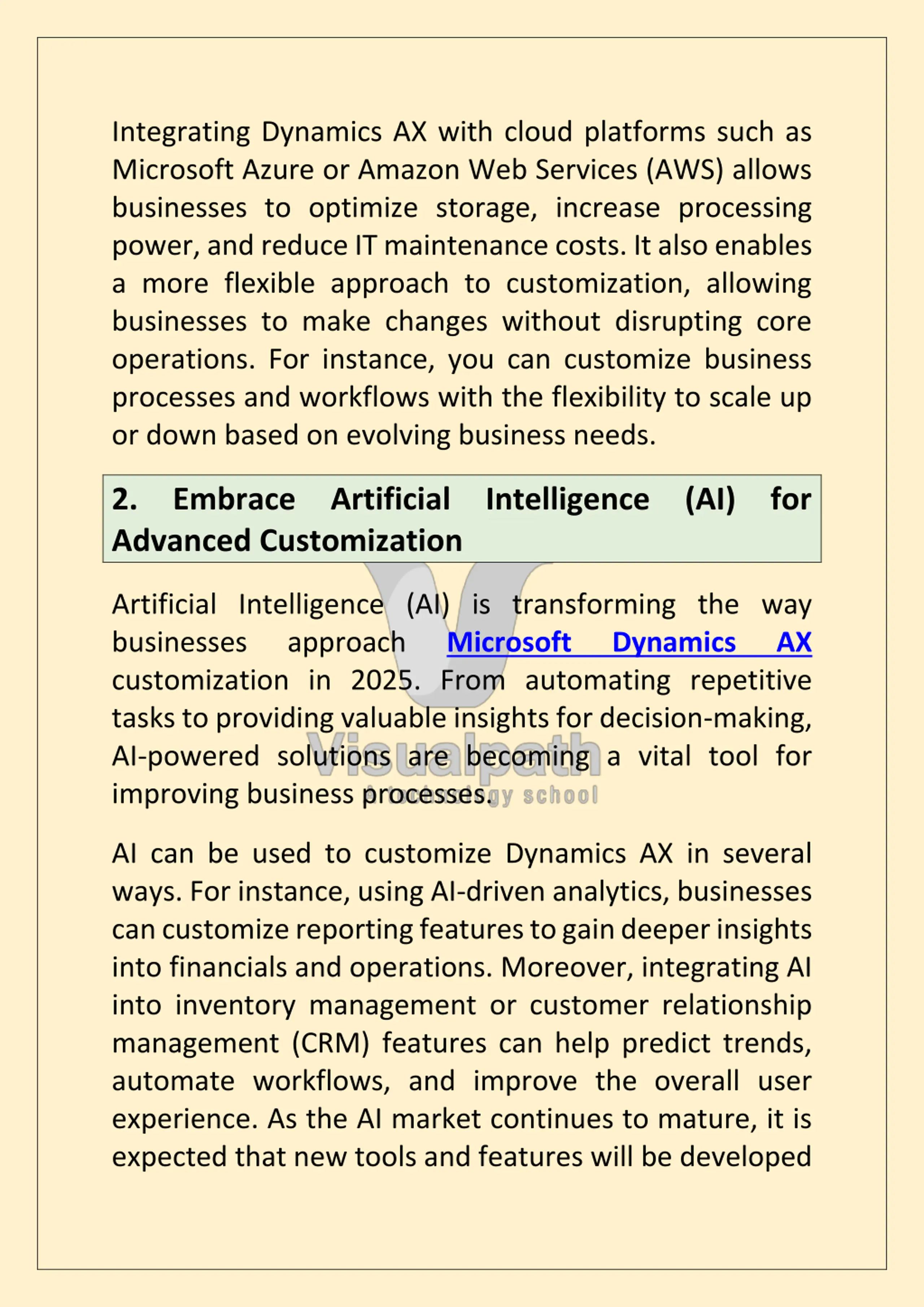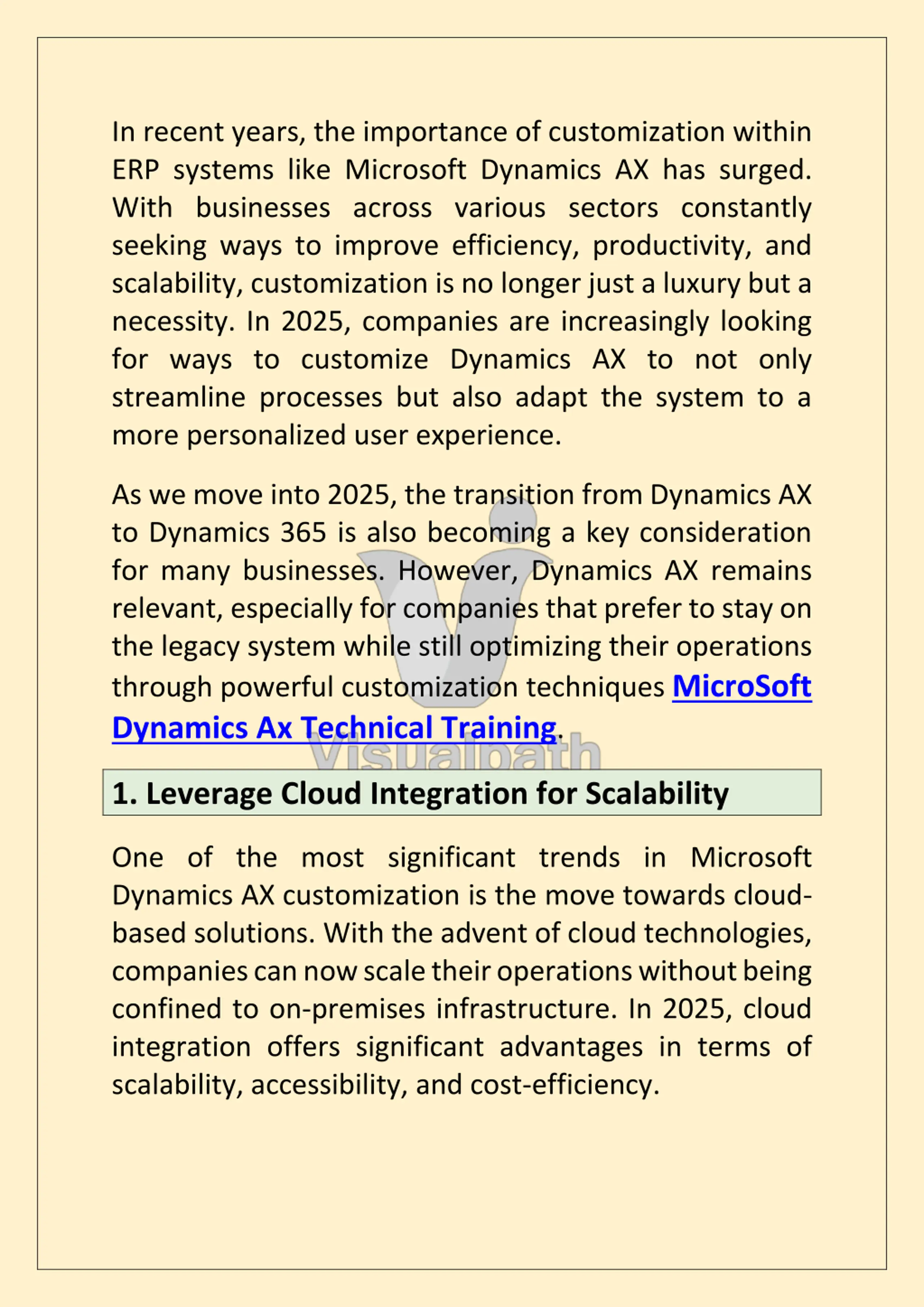 In recent years, the importance of customization within ERP systems like Microsoft Dynamics AX has surged. With businesses across various sectors constantly seeking ways to improve efficiency, productivity, and scalability, customization is no longer just a luxury but a necessity. In 2025, companies are increasingly looking for ways to customize Dynamics AX to not only streamline processes but also adapt the system to a more personalized user experience. As we move into 2025, the transition from Dynamics AX to Dynamics 365 is also becoming a key consideration for many businesses. However, Dynamics AX remains relevant, especially for companies that prefer to stay on the legacy system while still optimizing their operations through powerful customization techniques MicroSoft Dynamics Ax Technical Training. 1. Leverage Cloud Integration for Scalability One of the most significant trends in Microsoft Dynamics AX customization is the move towards cloud- based solutions. With the advent of cloud technologies, companies can now scale their operations without being confined to on-premises infrastructure. In 2025, cloud integration offers significant advantages in terms of scalability, accessibility, and cost-efficiency.