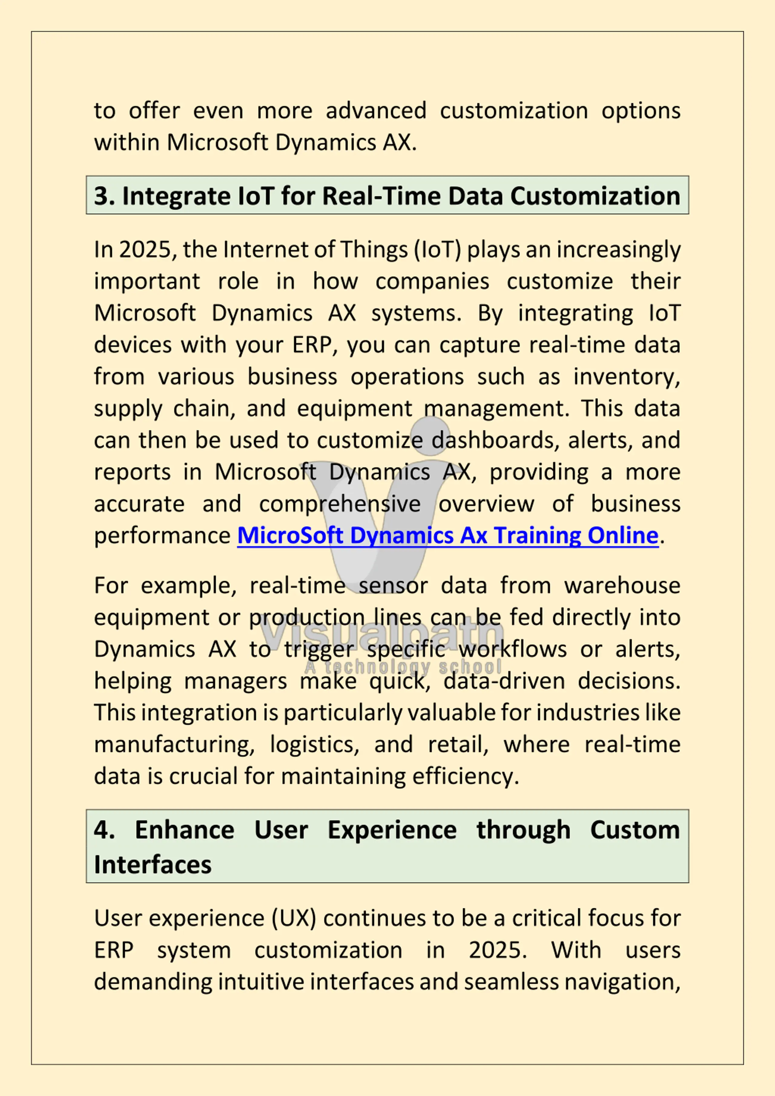 to offer even more advanced customization options within Microsoft Dynamics AX. 3. Integrate IoT for Real-Time Data Customization In 2025, the Internet of Things (IoT) plays an increasingly important role in how companies customize their Microsoft Dynamics AX systems. By integrating IoT devices with your ERP, you can capture real-time data from various business operations such as inventory, supply chain, and equipment management. This data can then be used to customize dashboards, alerts, and reports in Microsoft Dynamics AX, providing a more accurate and comprehensive overview of business performance MicroSoft Dynamics Ax Training Online. For example, real-time sensor data from warehouse equipment or production lines can be fed directly into Dynamics AX to trigger specific workflows or alerts, helping managers make quick, data-driven decisions. This integration is particularly valuable for industries like manufacturing, logistics, and retail, where real-time data is crucial for maintaining efficiency. 4. Enhance User Experience through Custom Interfaces User experience (UX) continues to be a critical focus for ERP system customization in 2025. With users demanding intuitive interfaces and seamless navigation,
