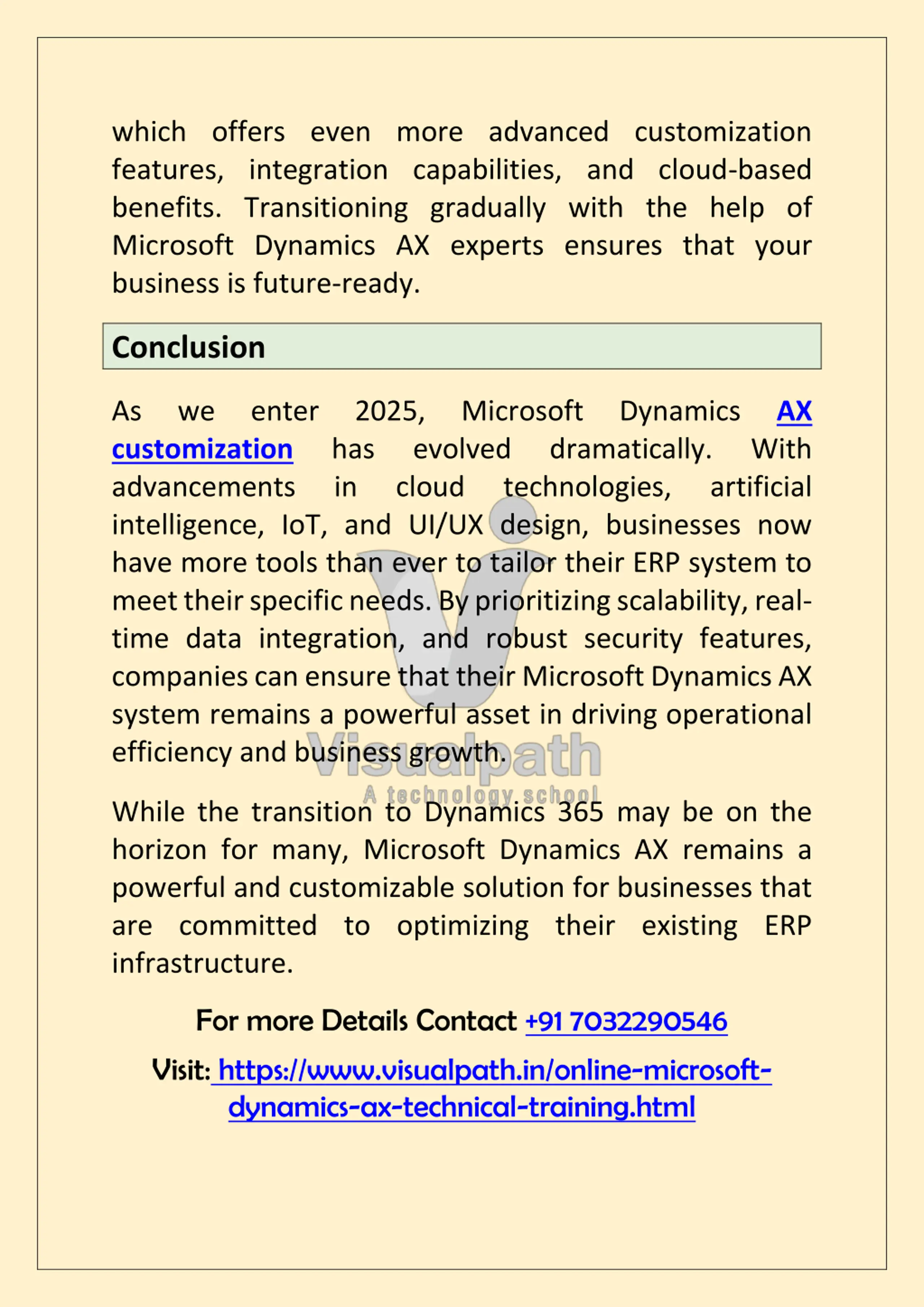 which offers even more advanced customization features, integration capabilities, and cloud-based benefits. Transitioning gradually with the help of Microsoft Dynamics AX experts ensures that your business is future-ready. Conclusion As customization advancements intelligence, IoT, and UI/UX design, businesses now have more tools than ever to tailor their ERP system to meet their specific needs. By prioritizing scalability, real- time data integration, and robust security features, companies can ensure that their Microsoft Dynamics AX system remains a powerful asset in driving operational efficiency and business growth. we enter 2025, has in Microsoft evolved cloud Dynamics AX dramatically. technologies, With artificial While the transition to Dynamics 365 may be on the horizon for many, Microsoft Dynamics AX remains a powerful and customizable solution for businesses that are committed to optimizing their existing ERP infrastructure. For more Details Contact +91 7032290546 Visit: https://www.visualpath.in/online-microsoft- dynamics-ax-technical-training.html