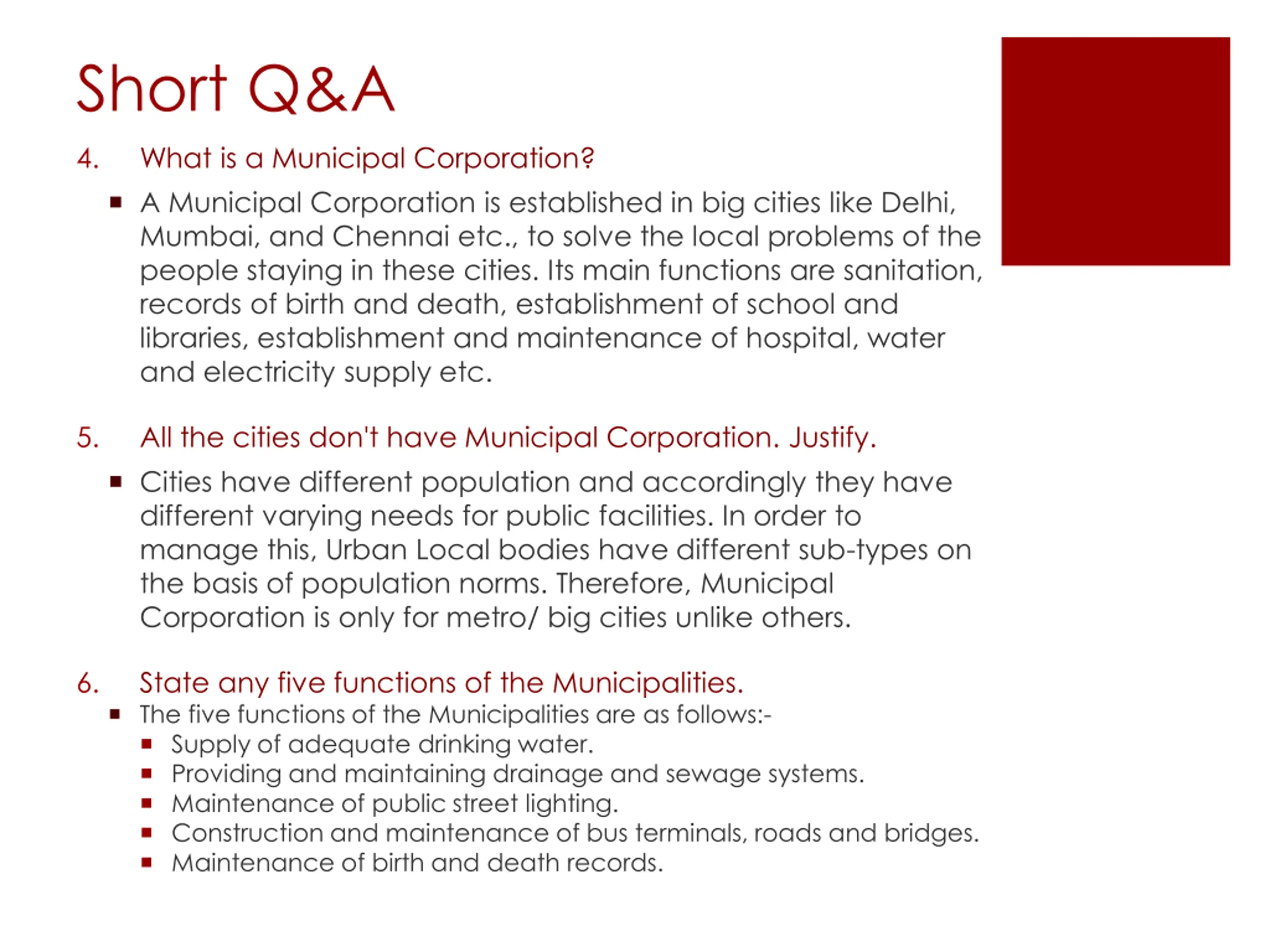 Short Q&A 4. What is a Municipal Corporation? A Municipal Corporation is established in big cities like Delhi, Mumbai, and Chennai etc., to solve the local problems of the people staying in these cities. Its main functions are sanitation, records of birth and death, establishment of school and libraries, establishment and maintenance of hospital, water and electricity supply etc. 5. All the cities don't have Municipal Corporation. Justify. Cities have different population and accordingly they have different varying needs for public facilities. In order to manage this, Urban Local bodies have different sub-types on the basis of population norms. Therefore, Municipal Corporation is only for metro/ big cities unlike others. 6. State any five functions of the Municipalities. The five functions of the Municipalities are as follows:- Supply of adequate drinking water. Providing and maintaining drainage and sewage systems. Maintenance of public street lighting. Construction and maintenance of bus terminals, roads and bridges. Maintenance of birth and death records.