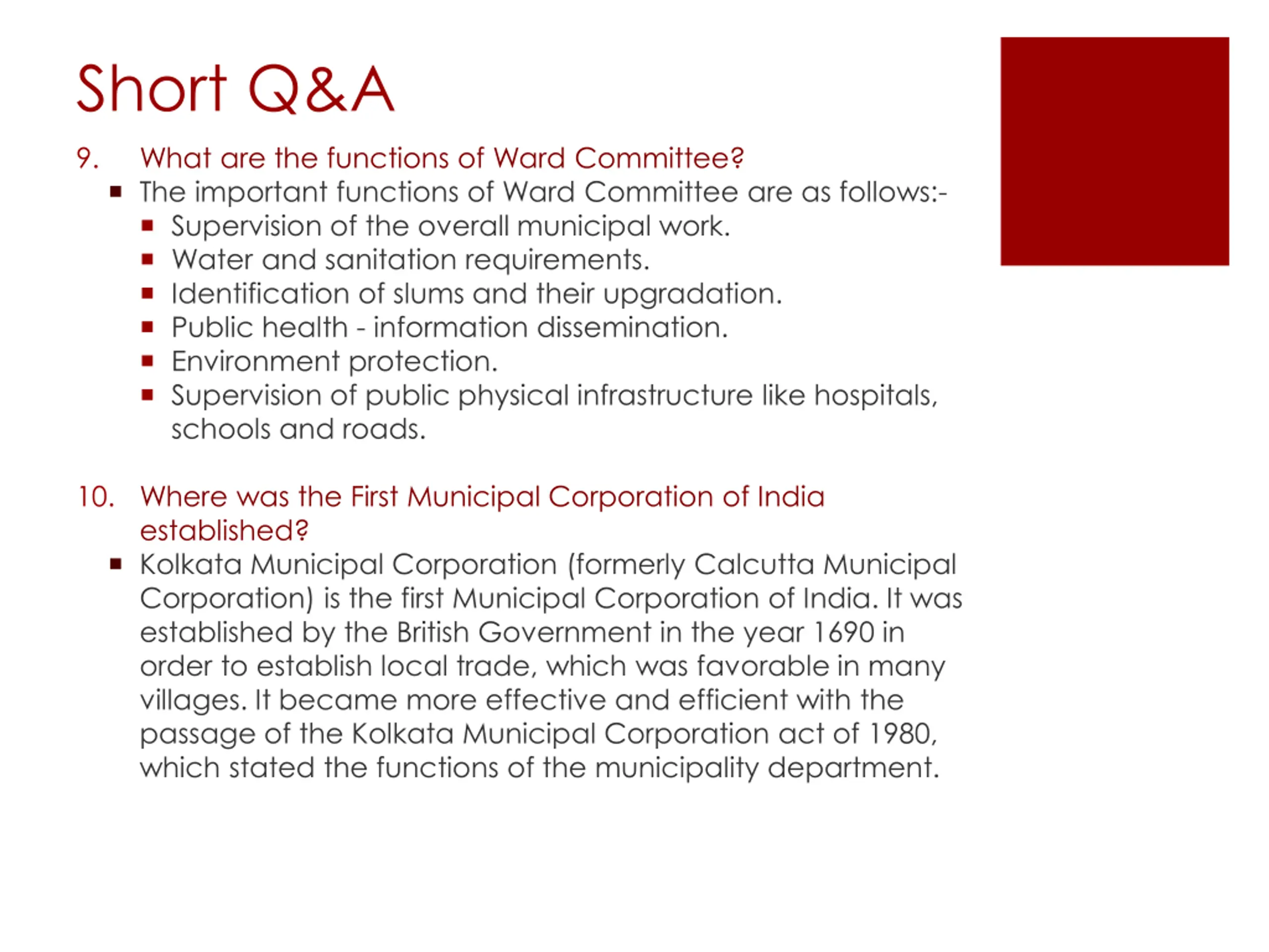 Short Q&A 9. What are the functions of Ward Committee? The important functions of Ward Committee are as follows:- Supervision of the overall municipal work. Water and sanitation requirements. Identification of slums and their upgradation. Public health - information dissemination. Environment protection. Supervision of public physical infrastructure like hospitals, schools and roads. 10. Where was the First Municipal Corporation of India established? Kolkata Municipal Corporation (formerly Calcutta Municipal Corporation) is the first Municipal Corporation of India. It was established by the British Government in the year 1690 in order to establish local trade, which was favorable in many villages. It became more effective and efficient with the passage of the Kolkata Municipal Corporation act of 1980, which stated the functions of the municipality department.