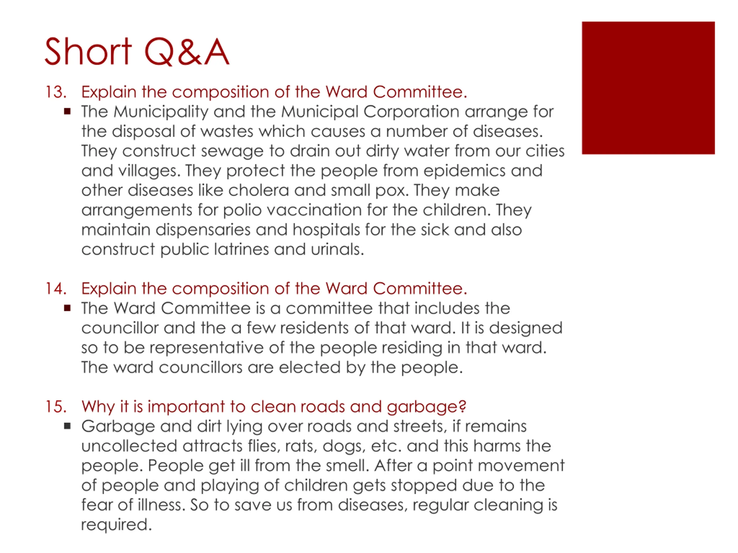 Short Q&A 13. Explain the composition of the Ward Committee. The Municipality and the Municipal Corporation arrange for the disposal of wastes which causes a number of diseases. They construct sewage to drain out dirty water from our cities and villages. They protect the people from epidemics and other diseases like cholera and small pox. They make arrangements for polio vaccination for the children. They maintain dispensaries and hospitals for the sick and also construct public latrines and urinals. 14. Explain the composition of the Ward Committee. The Ward Committee is a committee that includes the councillor and the a few residents of that ward. It is designed so to be representative of the people residing in that ward. The ward councillors are elected by the people. 15. Why it is important to clean roads and garbage? Garbage and dirt lying over roads and streets, if remains uncollected attracts flies, rats, dogs, etc. and this harms the people. People get ill from the smell. After a point movement of people and playing of children gets stopped due to the fear of illness. So to save us from diseases, regular cleaning is required.