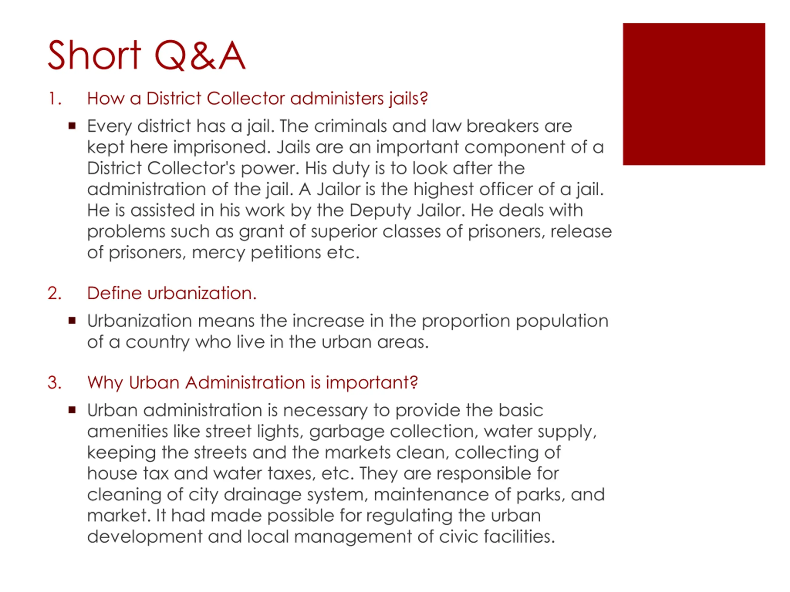 Short Q&A 1. How a District Collector administers jails? Every district has a jail. The criminals and law breakers are kept here imprisoned. Jails are an important component of a District Collector's power. His duty is to look after the administration of the jail. A Jailor is the highest officer of a jail. He is assisted in his work by the Deputy Jailor. He deals with problems such as grant of superior classes of prisoners, release of prisoners, mercy petitions etc. 2. Define urbanization. Urbanization means the increase in the proportion population of a country who live in the urban areas. 3. Why Urban Administration is important? Urban administration is necessary to provide the basic amenities like street lights, garbage collection, water supply, keeping the streets and the markets clean, collecting of house tax and water taxes, etc. They are responsible for cleaning of city drainage system, maintenance of parks, and market. It had made possible for regulating the urban development and local management of civic facilities.