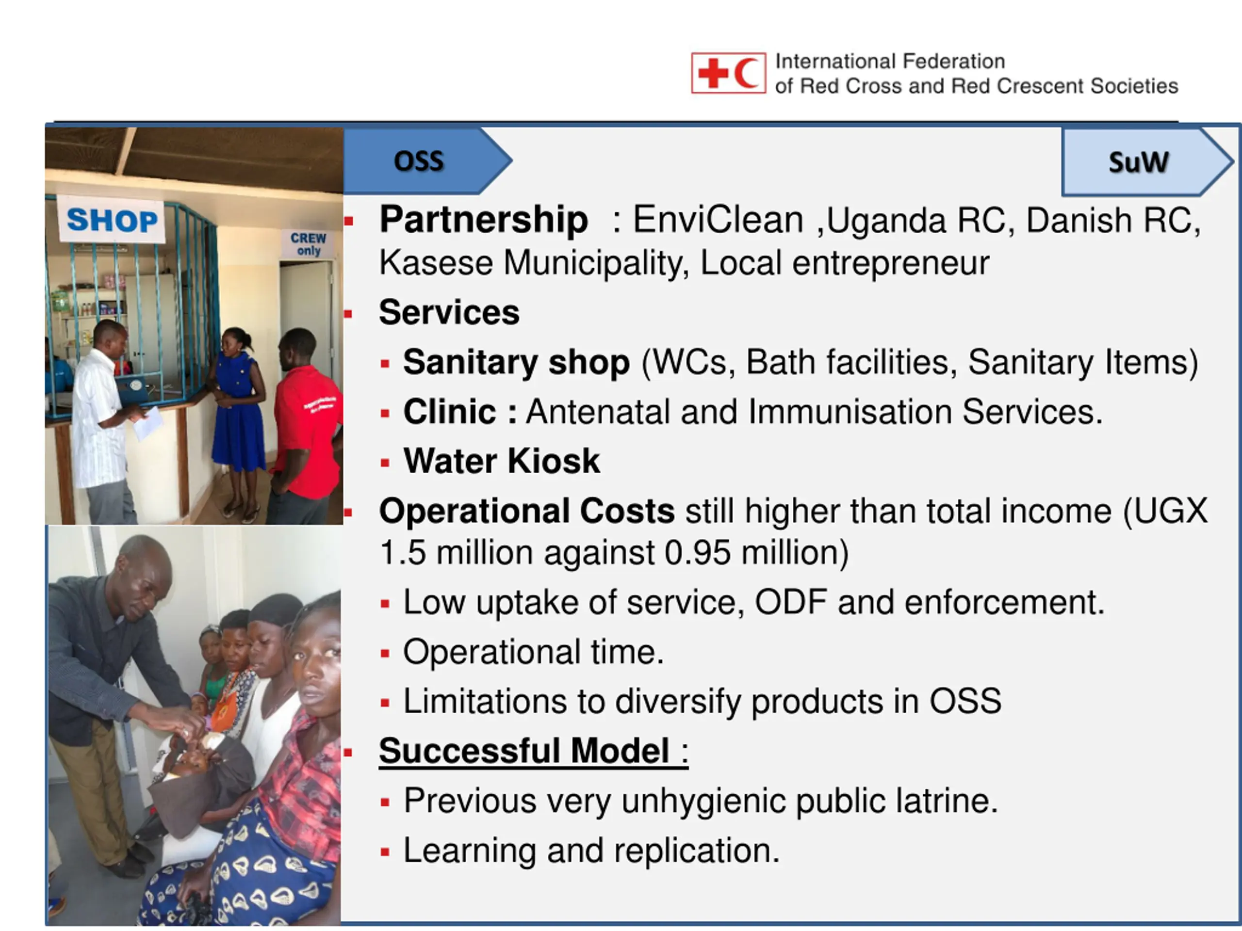 OSS Partnership : EnviClean ,Uganda RC, Danish RC, Kasese Municipality, Local entrepreneur Services Sanitary shop (WCs, Bath facilities, Sanitary Items) Clinic : Antenatal and Immunisation Services. Water Kiosk Operational Costs still higher than total income (UGX 1.5 million against 0.95 million) Low uptake of service, ODF and enforcement. Operational time. Limitations to diversify products in OSS Successful Model : Previous very unhygienic public latrine. Learning and replication.