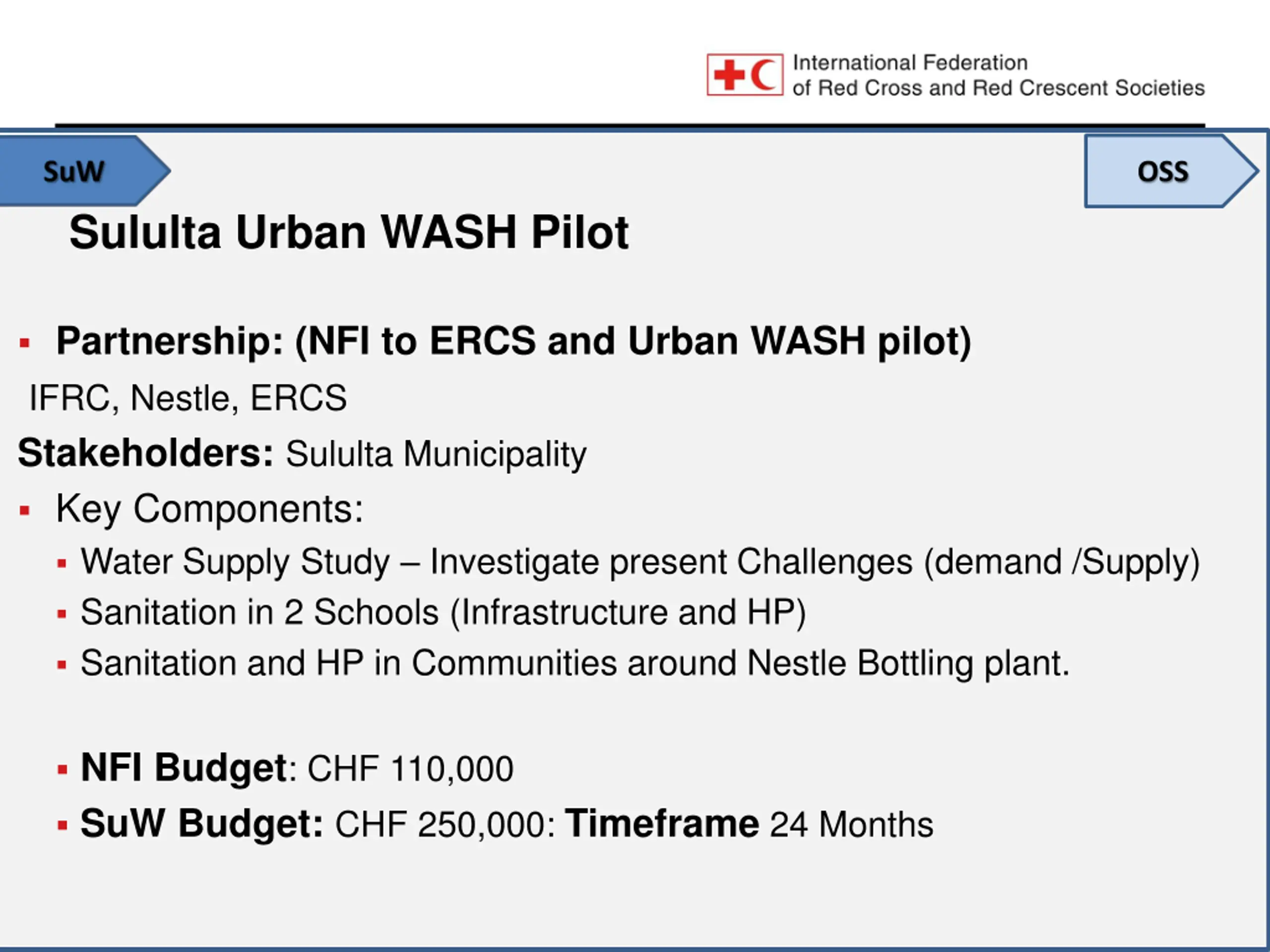 OSS Sululta Urban WASH Pilot Partnership: (NFI to ERCS and Urban WASH pilot) IFRC, Nestle, ERCS Stakeholders: Sululta Municipality Key Components: Water Supply Study Investigate present Challenges (demand /Supply) Sanitation in 2 Schools (Infrastructure and HP) Sanitation and HP in Communities around Nestle Bottling plant. NFI Budget: CHF 110,000 SuW Budget: CHF 250,000: Timeframe 24 Months