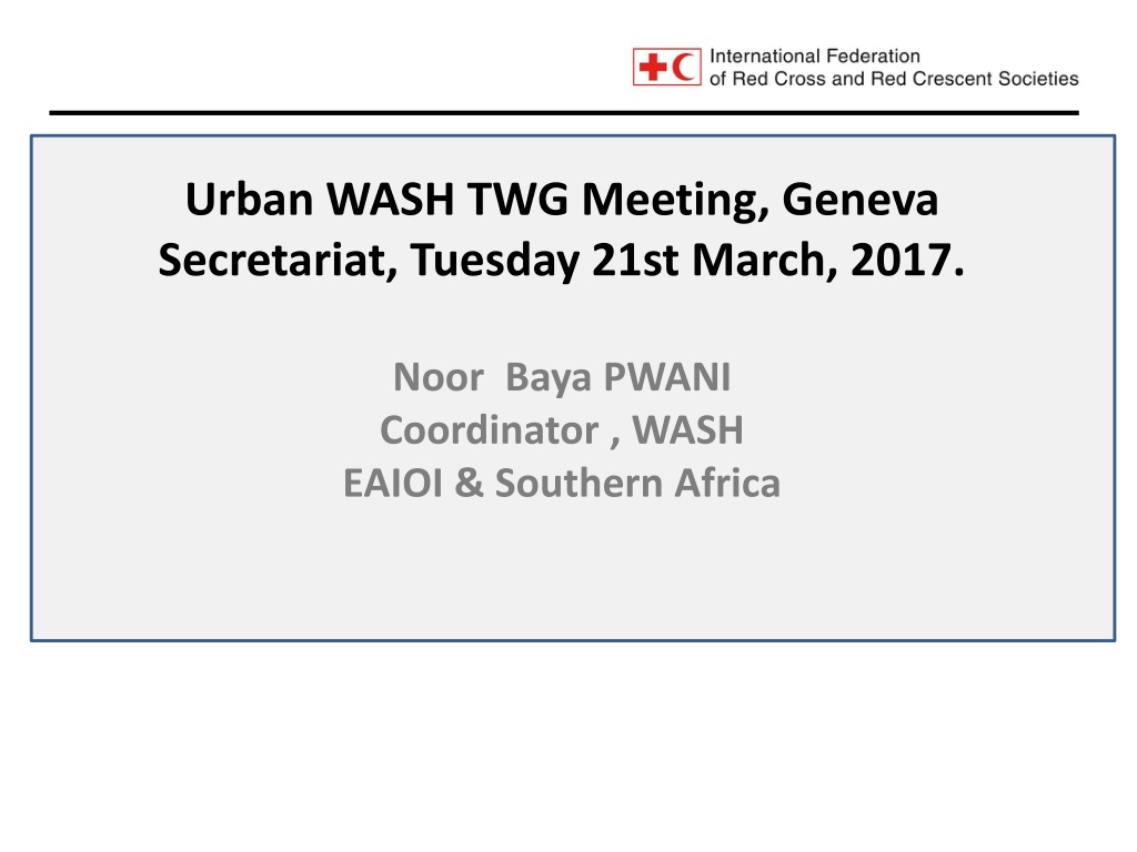 Urban WASH TWG Meeting, Geneva Secretariat, Tuesday 21st March, 2017. Noor Baya PWANI Coordinator , WASH EAIOI & Southern Africa