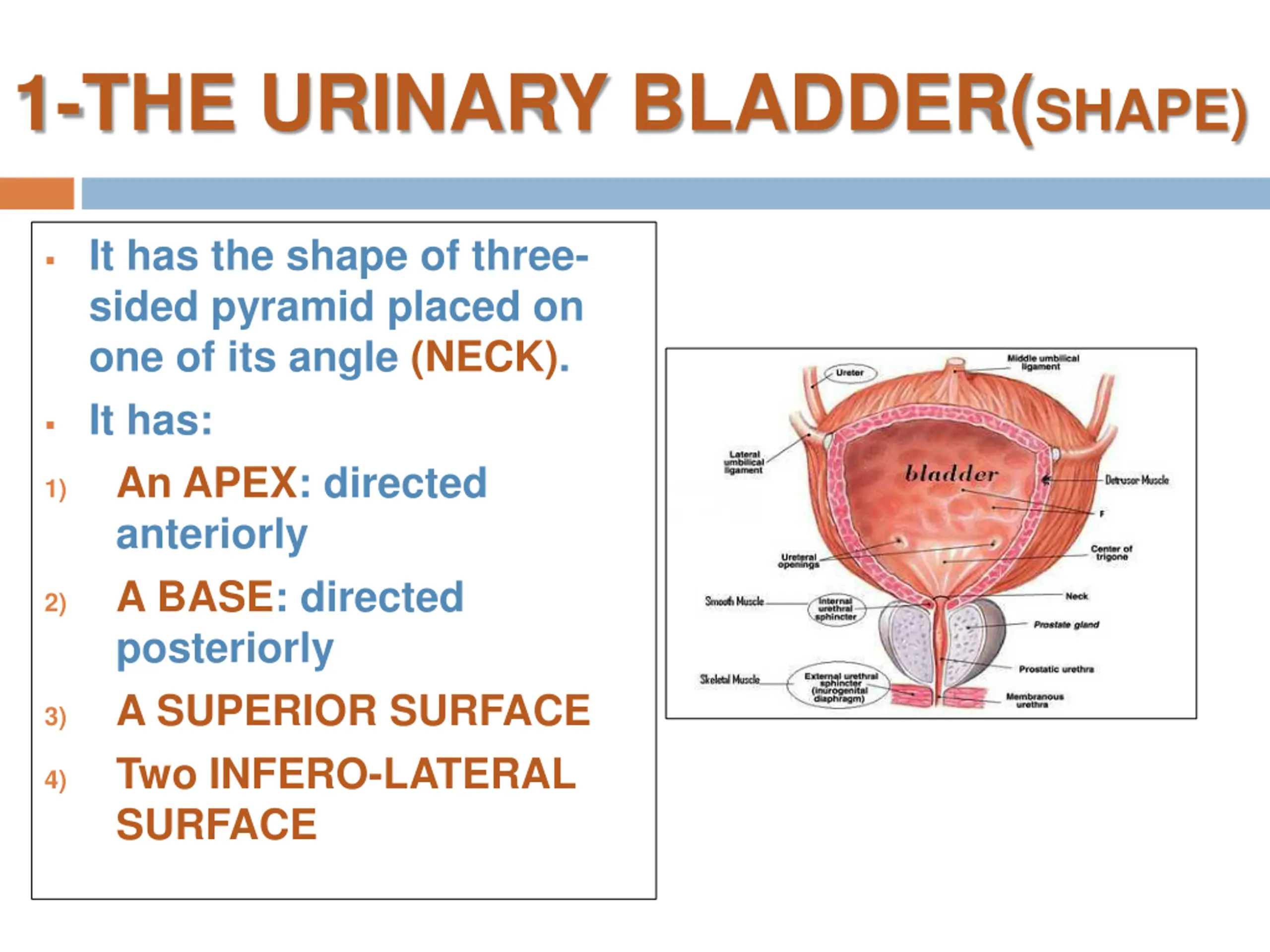 1-THE URINARY BLADDER(SHAPE) It has the shape of three- sided pyramid placed on one of its angle (NECK). Picture showing the anatomy of the bladder It has: An APEX: directed anteriorly A BASE: directed posteriorly A SUPERIOR SURFACE Two INFERO-LATERAL SURFACE 1) 2) 3) 4)