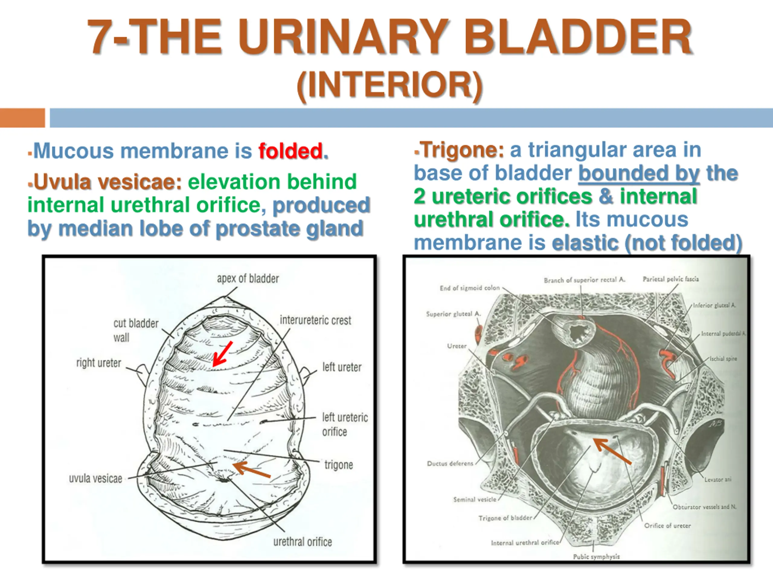 7-THE URINARY BLADDER (INTERIOR) Trigone: a triangular area in base of bladder bounded by the 2 ureteric orifices & internal urethral orifice. Its mucous membrane is elastic (not folded) Mucous membrane is folded. Uvula vesicae: elevation behind internal urethral orifice, produced by median lobe of prostate gland