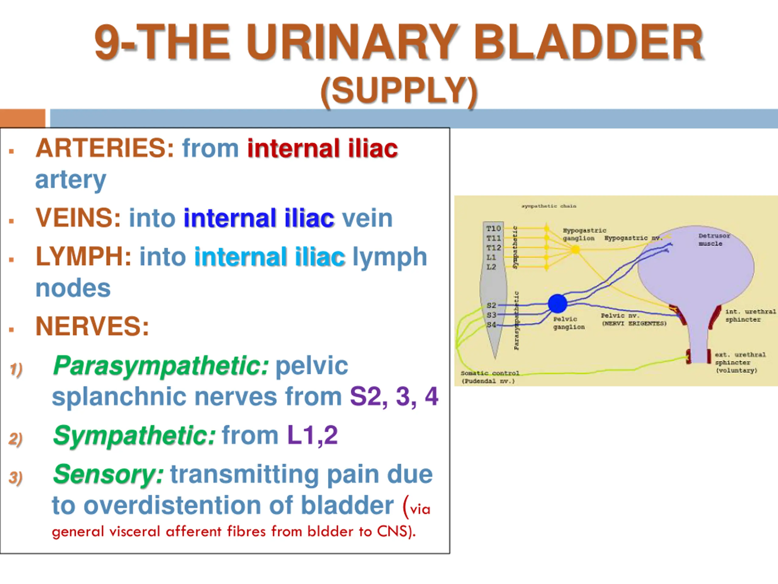 9-THE URINARY BLADDER (SUPPLY) ARTERIES: from internal iliac artery http://3.bp.blogspot.com/-LqINgObPWSs/TkoSQl4QKEI/AAAAAAAAACE/qNVYq5G5rho/s400/urinary+bladder.png VEINS: into internal iliac vein LYMPH: into internal iliac lymph nodes NERVES: Parasympathetic: pelvic splanchnic nerves from S2, 3, 4 Sympathetic: from L1,2 Sensory: transmitting pain due to overdistention of bladder (via general visceral afferent fibres from bldder to CNS). 1) 2) 3)