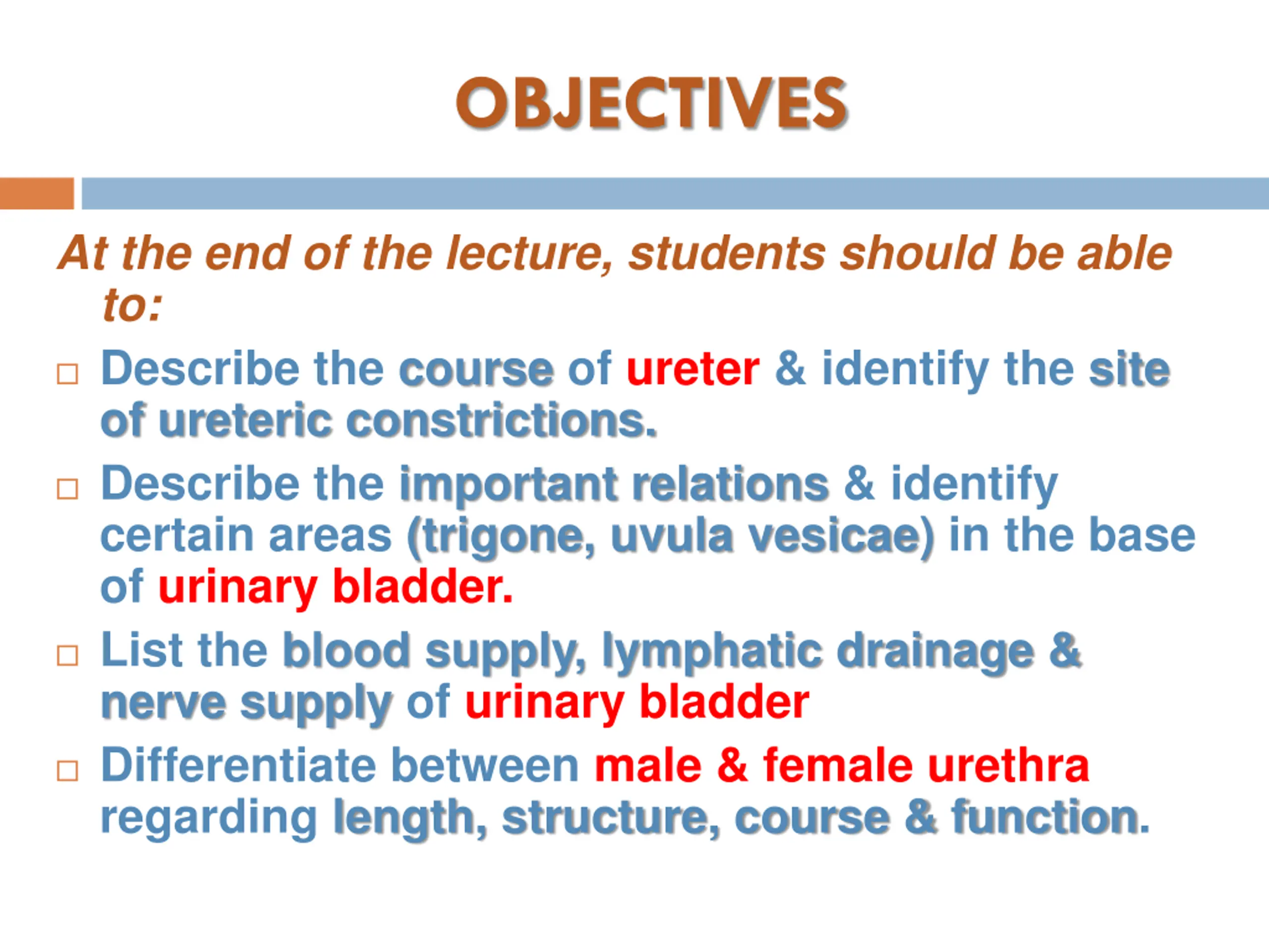 OBJECTIVES At the end of the lecture, students should be able to: Describe the course of ureter & identify the site of ureteric constrictions. Describe the important relations & identify certain areas (trigone, uvula vesicae) in the base of urinary bladder. List the blood supply, lymphatic drainage & nerve supply of urinary bladder Differentiate between male & female urethra regarding length, structure, course & function.