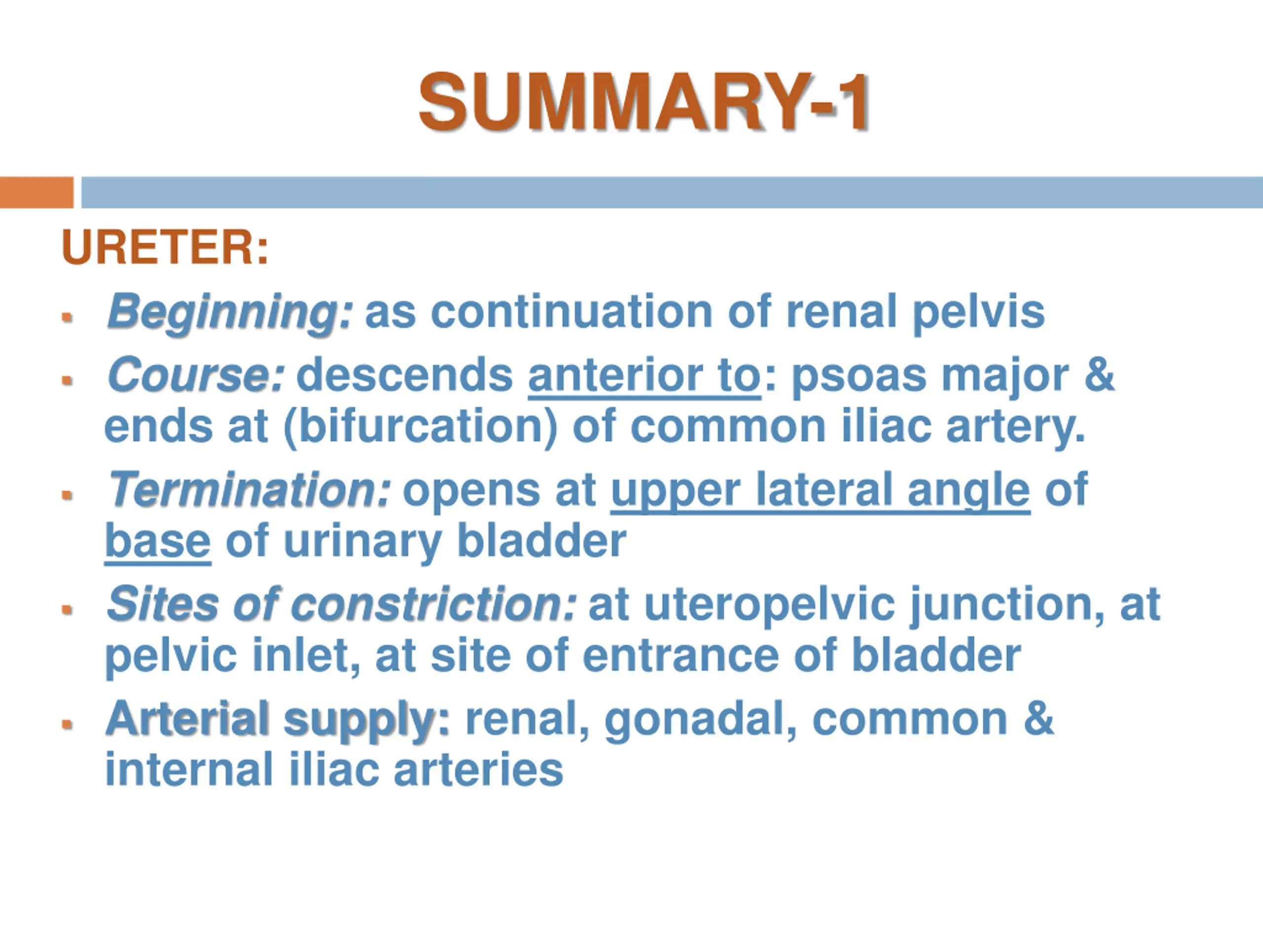 SUMMARY-1 URETER: Beginning: as continuation of renal pelvis Course: descends anterior to: psoas major & ends at (bifurcation) of common iliac artery. Termination: opens at upper lateral angle of base of urinary bladder Sites of constriction: at uteropelvic junction, at pelvic inlet, at site of entrance of bladder Arterial supply: renal, gonadal, common & internal iliac arteries