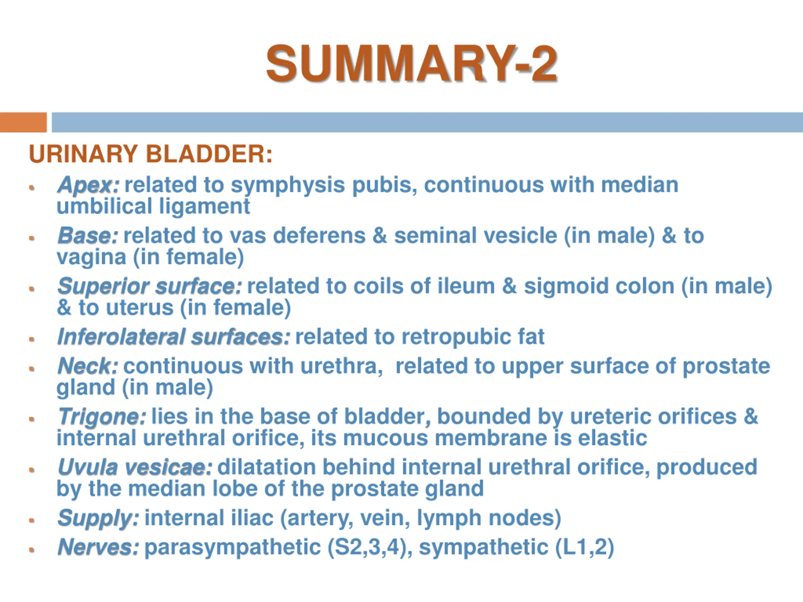 SUMMARY-2 URINARY BLADDER: Apex: related to symphysis pubis, continuous with median umbilical ligament Base: related to vas deferens & seminal vesicle (in male) & to vagina (in female) Superior surface: related to coils of ileum & sigmoid colon (in male) & to uterus (in female) Inferolateral surfaces: related to retropubic fat Neck: continuous with urethra, related to upper surface of prostate gland (in male) Trigone: lies in the base of bladder, bounded by ureteric orifices & internal urethral orifice, its mucous membrane is elastic Uvula vesicae: dilatation behind internal urethral orifice, produced by the median lobe of the prostate gland Supply: internal iliac (artery, vein, lymph nodes) Nerves: parasympathetic (S2,3,4), sympathetic (L1,2)