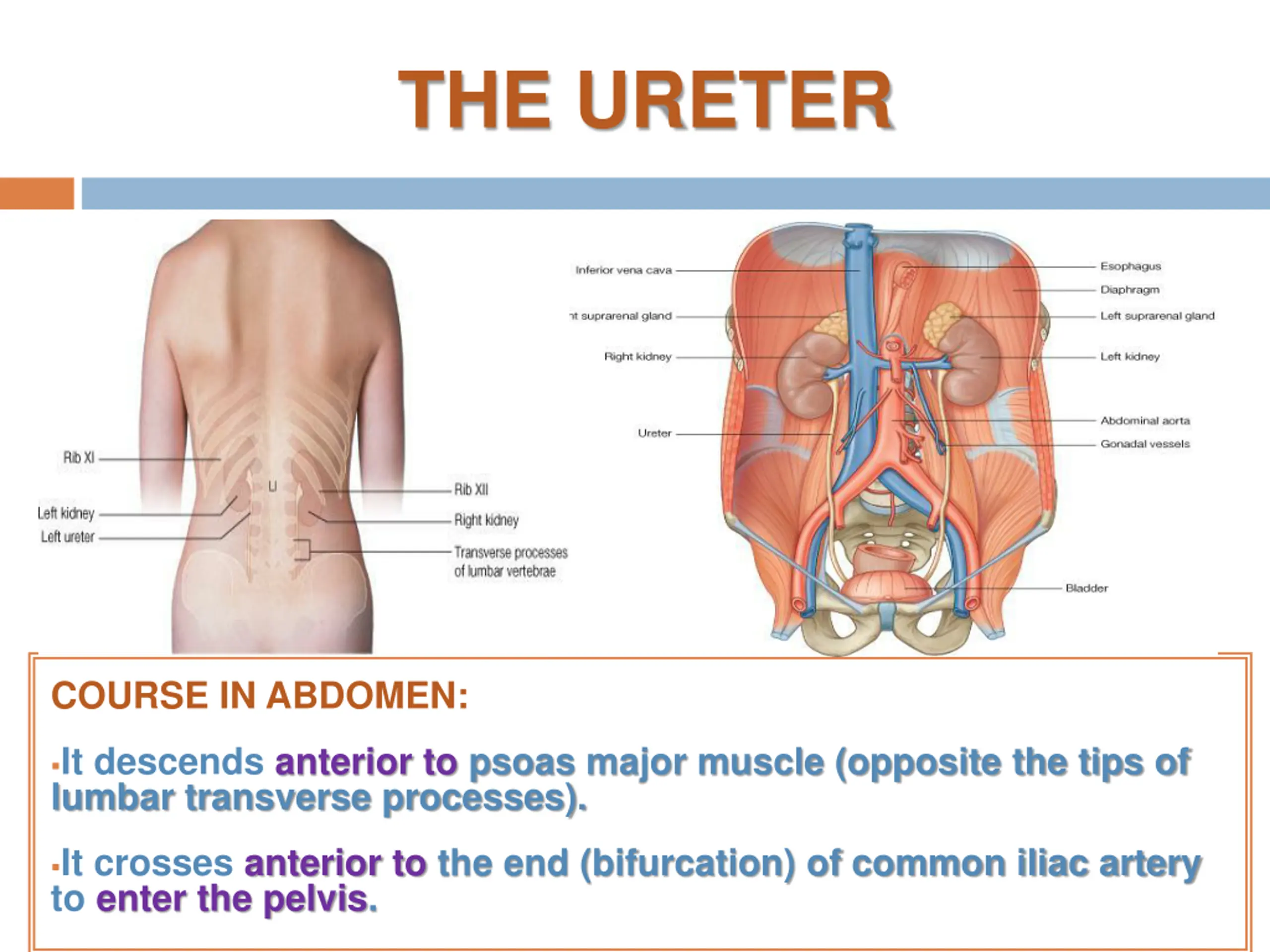 THE URETER COURSE IN ABDOMEN: It descends anterior to psoas major muscle (opposite the tips of lumbar transverse processes). It crosses anterior to the end (bifurcation) of common iliac artery to enter the pelvis.