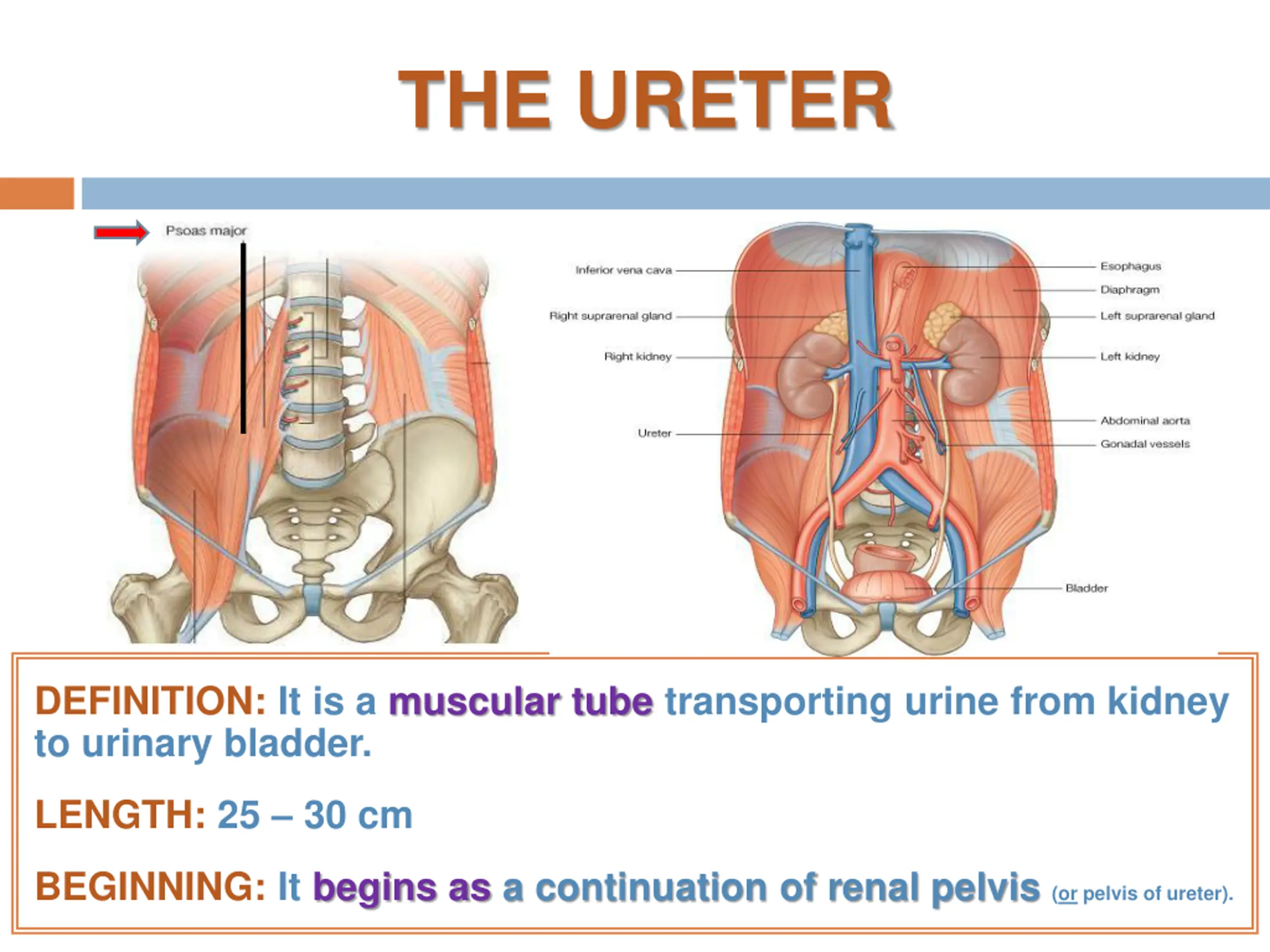 THE URETER DEFINITION: It is a muscular tube transporting urine from kidney to urinary bladder. LENGTH: 25 30 cm BEGINNING: It begins as a continuation of renal pelvis (or pelvis of ureter).