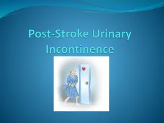 Type Urge Incontinence Definition Need to go to toilet suddenly, bladder contracts when it shouldn t Increase in abdominal pressure overcomes the closing pressure of the bladder Causes Strokes, Dementia, AD, MS, Parkinson's, injuries, pelvic floor atrophy, prostate enlargement, constipation Pregnancy and childbirth lack of estrogen post menopause cause muscular atrophy enlarged prostate, prostate cancer treatments or prostate surgery Obstruction, enlarged prostate, prostate surgery, constipation, faecal impaction, and nerve damage from strokes or diabetes Symptoms Urgency Involuntary contractions of the bladder Incontinent when sneeze, laugh, climb stairs, or lift objects Stress Incontinence Overflow Incontinence Bladder never completely empties due to weak bladder contractions, or inability to contract Caused by other disabilities Sufferers frequently feel the need to go and often leak small amounts of urine Functional Incontinence Arthritis, hip, knee, reduced function, neurological disorders, stroke complications, AD, MS Severe dementia, Parkinson's disease, neurological disorders, Still feel the need to void but just cant get there in time Mixed Incontinence Combination of stress and urge incontinence