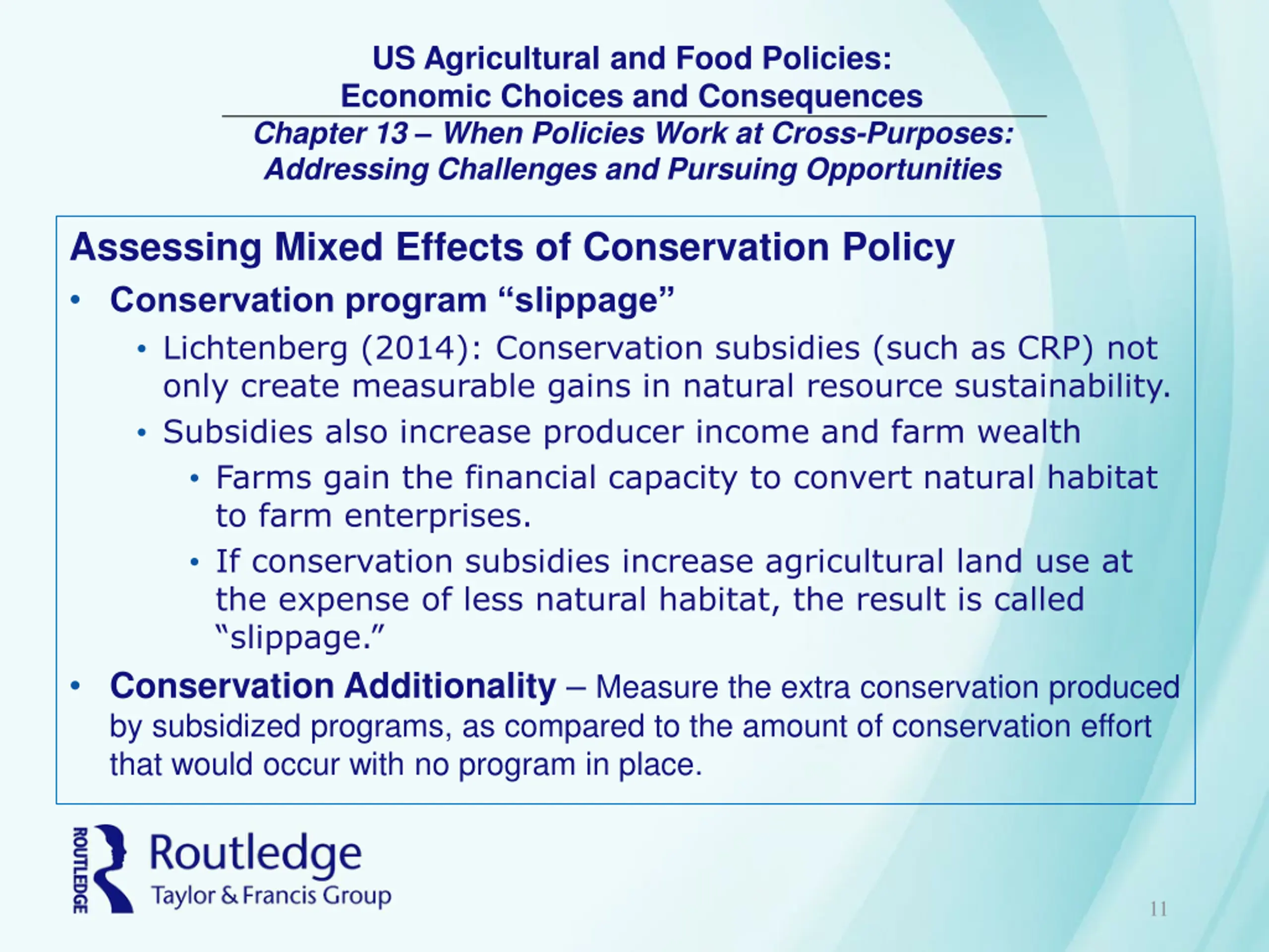 US Agricultural and Food Policies: Economic Choices and Consequences Chapter 13 When Policies Work at Cross-Purposes: Addressing Challenges and Pursuing Opportunities Assessing Mixed Effects of Conservation Policy Conservation program slippage Lichtenberg (2014): Conservation subsidies (such as CRP) not only create measurable gains in natural resource sustainability. Subsidies also increase producer income and farm wealth Farms gain the financial capacity to convert natural habitat to farm enterprises. If conservation subsidies increase agricultural land use at the expense of less natural habitat, the result is called slippage. Conservation Additionality Measure the extra conservation produced by subsidized programs, as compared to the amount of conservation effort that would occur with no program in place. 11