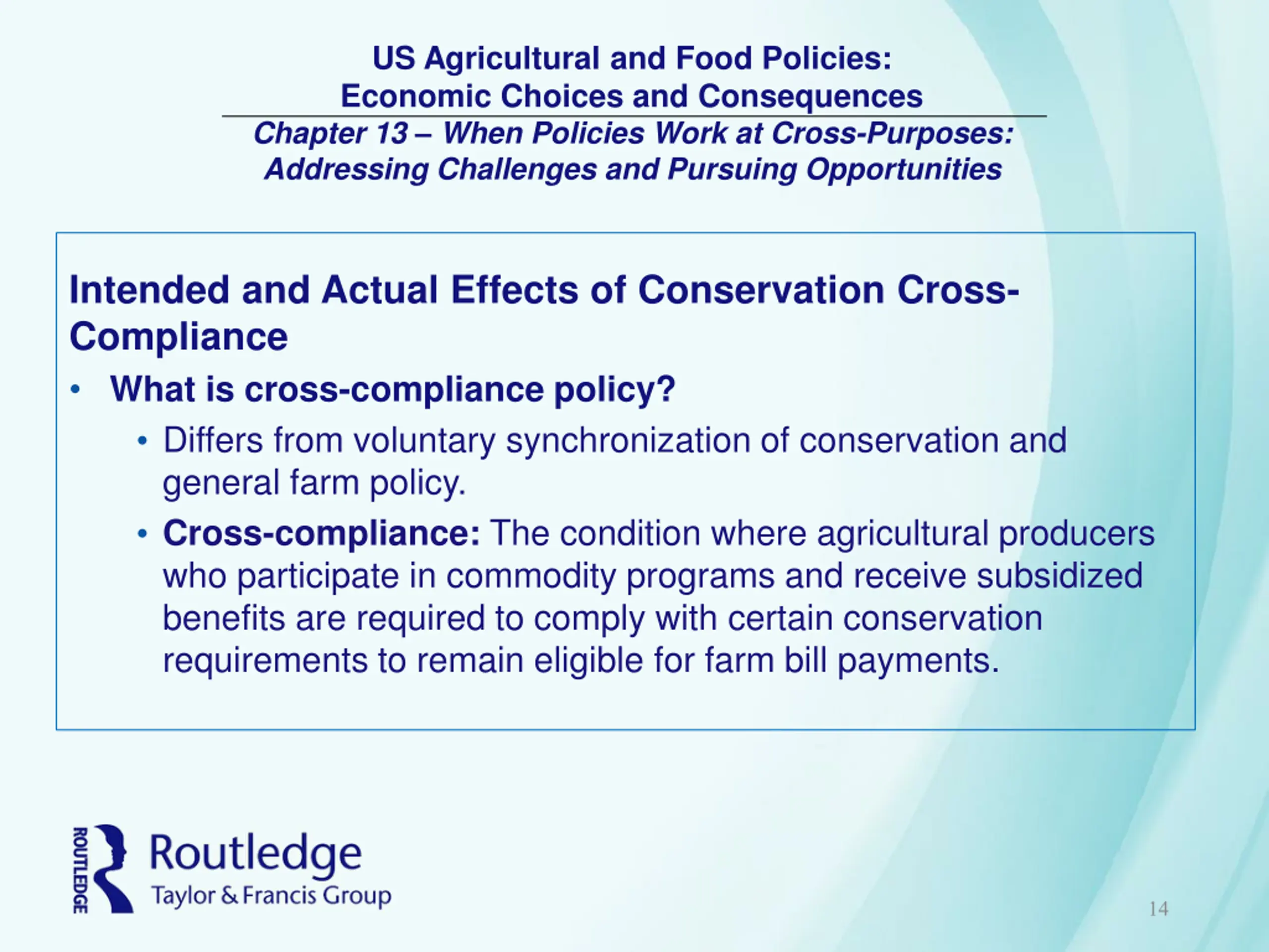 US Agricultural and Food Policies: Economic Choices and Consequences Chapter 13 When Policies Work at Cross-Purposes: Addressing Challenges and Pursuing Opportunities Intended and Actual Effects of Conservation Cross- Compliance What is cross-compliance policy? Differs from voluntary synchronization of conservation and general farm policy. Cross-compliance: The condition where agricultural producers who participate in commodity programs and receive subsidized benefits are required to comply with certain conservation requirements to remain eligible for farm bill payments. 14