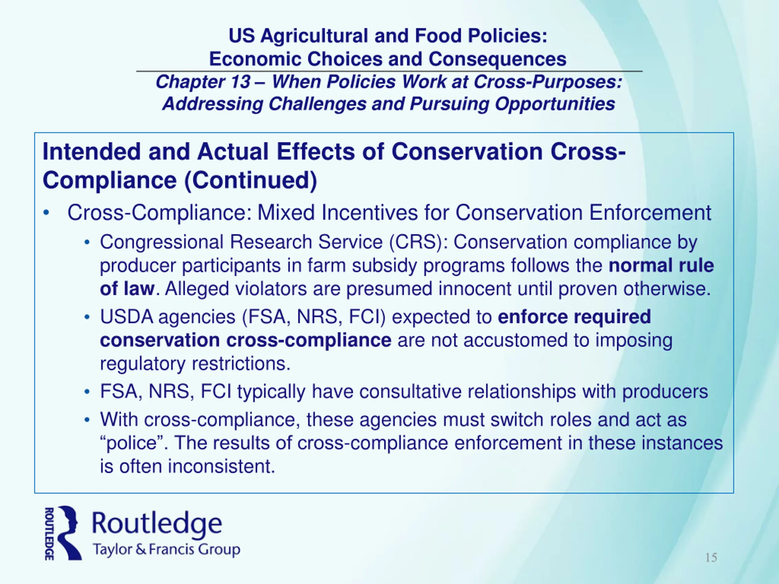 US Agricultural and Food Policies: Economic Choices and Consequences Chapter 13 When Policies Work at Cross-Purposes: Addressing Challenges and Pursuing Opportunities Intended and Actual Effects of Conservation Cross- Compliance(Continued) Cross-Compliance: Mixed Incentives for Conservation Enforcement Congressional Research Service (CRS): Conservation compliance by producer participants in farm subsidy programs follows the normal rule of law. Alleged violators are presumed innocent until proven otherwise. USDA agencies (FSA, NRS, FCI) expected to enforce required conservation cross-compliance are not accustomed to imposing regulatory restrictions. FSA, NRS, FCI typically have consultative relationships with producers With cross-compliance, these agencies must switch roles and act as police . The results of cross-compliance enforcement in these instances is often inconsistent. 15