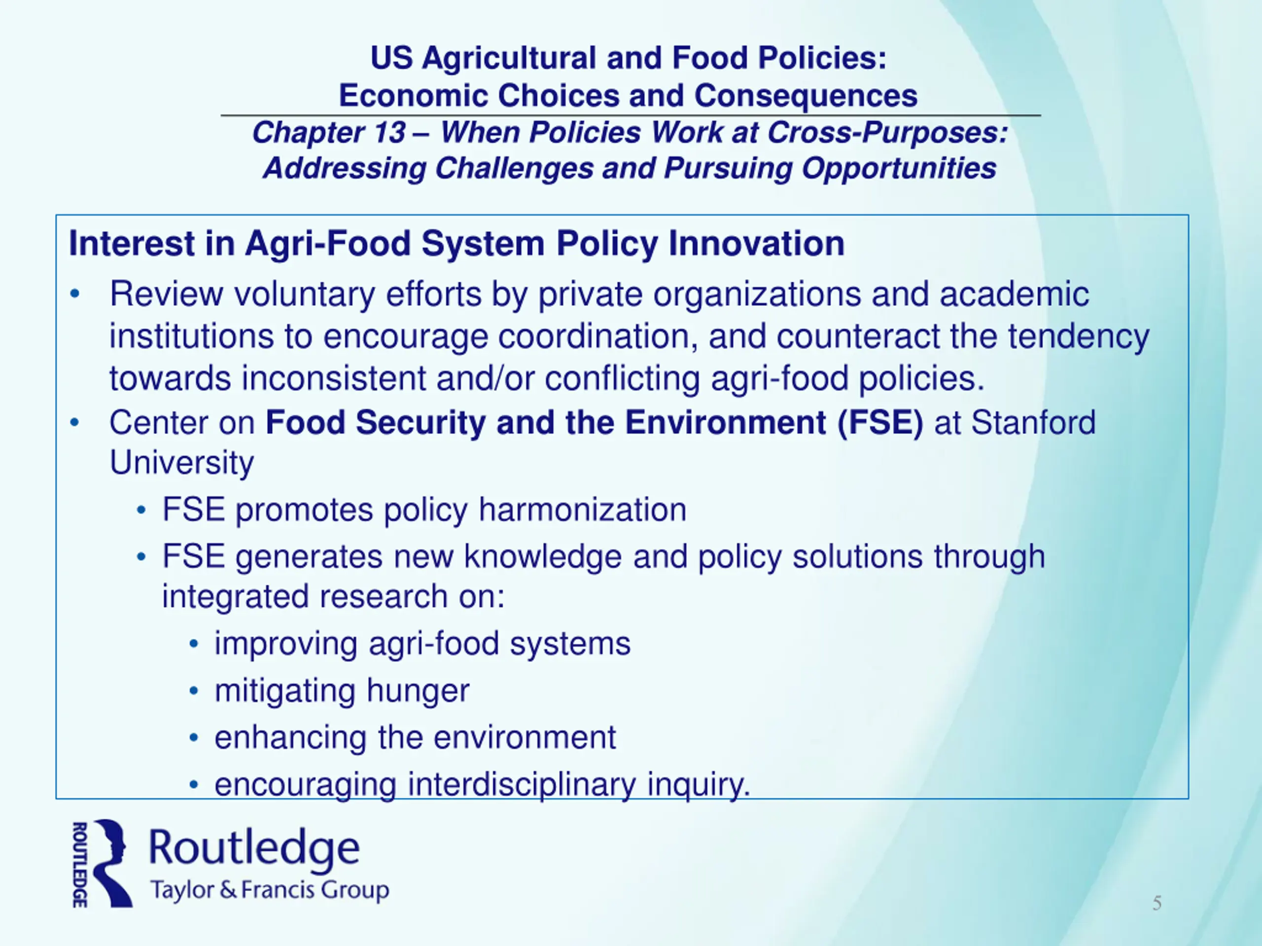 US Agricultural and Food Policies: Economic Choices and Consequences Chapter 13 When Policies Work at Cross-Purposes: Addressing Challenges and Pursuing Opportunities Interest in Agri-Food System Policy Innovation Review voluntary efforts by private organizations and academic institutions to encourage coordination, and counteract the tendency towards inconsistent and/or conflicting agri-food policies. Center on Food Security and the Environment (FSE) at Stanford University FSE promotes policy harmonization FSE generates new knowledge and policy solutions through integrated research on: improving agri-food systems mitigating hunger enhancing the environment encouraging interdisciplinary inquiry. 5