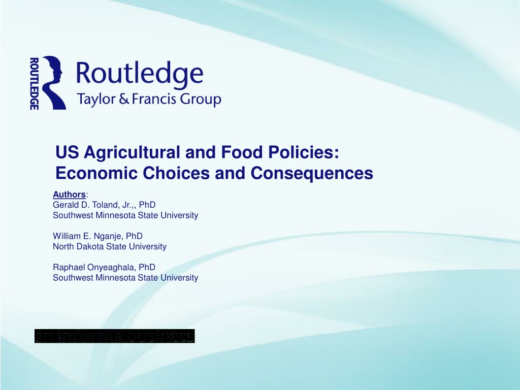 US Agricultural and Food Policies: Economic Choices and Consequences Authors: Gerald D. Toland, Jr.,, PhD Southwest Minnesota State University William E. Nganje, PhD North Dakota State University Raphael Onyeaghala, PhD Southwest Minnesota State University