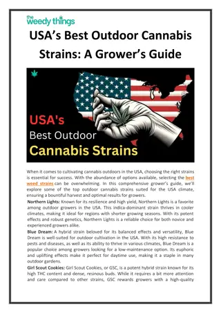 When it comes to cultivating cannabis outdoors in the USA, choosing the right strains is essential for success. With the abundance of options available, selecting the best weed strains can be overwhelming. In this comprehensive grower s guide, we ll explore some of the top outdoor cannabis strains suited for the USA climate, ensuring a bountiful harvest and optimal results for growers. Northern Lights: Known for its resilience and high yield, Northern Lights is a favorite among outdoor growers in the USA. This indica- dominant strain thrives in cooler climates, making it ideal for regions with shorter growing seasons. With its potent effects and robust genetics, Northern Lights is a reliable choice for both novice and experienced growers alike. Read More www.theweedythings.com