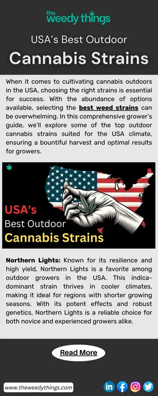 Purple Kush: Purple Kush is an indica-dominant strain known for its relaxing and sedating effects. With its vibrant purple hues and sweet, fruity aroma, Purple Kush is a visually striking and aromatic addition to any outdoor garden. While it may require a bit more attention and care compared to other strains, Purple Kush rewards growers with a high yield of potent and flavorful buds. Pineapple Express: Pineapple Express is a hybrid strain known for its tropical aroma and uplifting effects. With its high resistance to mold and mildew, as well as its ability to thrive in warm and humid conditions, Pineapple Express is well-suited for outdoor cultivation in the USA. Its sweet and fruity flavor profile, coupled with its energizing and euphoric effects, makes it a popular choice for outdoor growers looking for a taste of the tropics. Selecting the best outdoor cannabis strains consideration of factors such as climate, growing conditions, and desired effects. Whether you re a novice grower or an experienced cultivator, choosing strains that are well-suited for outdoor growing can help ensure a successful and rewarding harvest. With the abundance of options available, growers have the opportunity to explore a wide range of flavors, aromas, and effects, making outdoor cultivation an exciting and fulfilling endeavor. Source: https://www.theweedythings.com/blog/usas-best-outdoor-cannabis-strains- a-growers-guide/ for cultivation in the USA requires careful