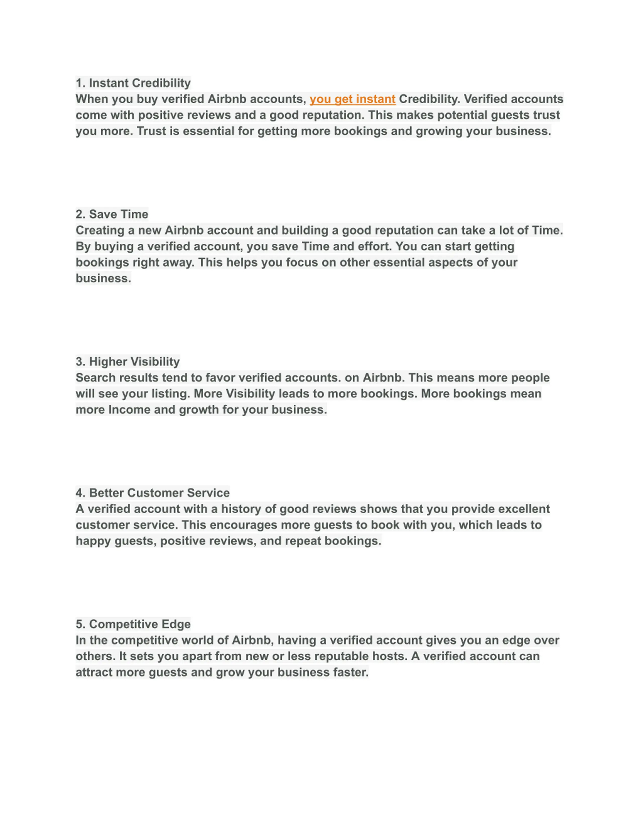 1. Instant Credibility When you buy verified Airbnb accounts, you get instant Credibility. Verified accounts come with positive reviews and a good reputation. This makes potential guests trust you more. Trust is essential for getting more bookings and growing your business. 2. Save Time Creating a new Airbnb account and building a good reputation can take a lot of Time. By buying a verified account, you save Time and effort. You can start getting bookings right away. This helps you focus on other essential aspects of your business. 3. Higher Visibility Search results tend to favor verified accounts. on Airbnb. This means more people will see your listing. More Visibility leads to more bookings. More bookings mean more Income and growth for your business. 4. Better Customer Service A verified account with a history of good reviews shows that you provide excellent customer service. This encourages more guests to book with you, which leads to happy guests, positive reviews, and repeat bookings. 5. Competitive Edge In the competitive world of Airbnb, having a verified account gives you an edge over others. It sets you apart from new or less reputable hosts. A verified account can attract more guests and grow your business faster.