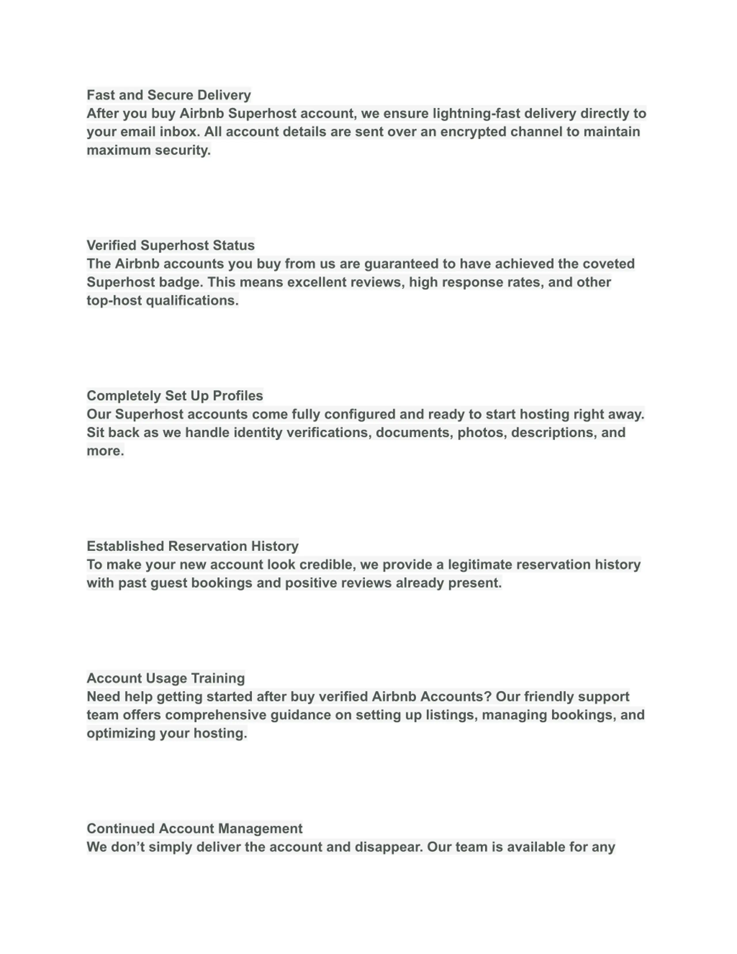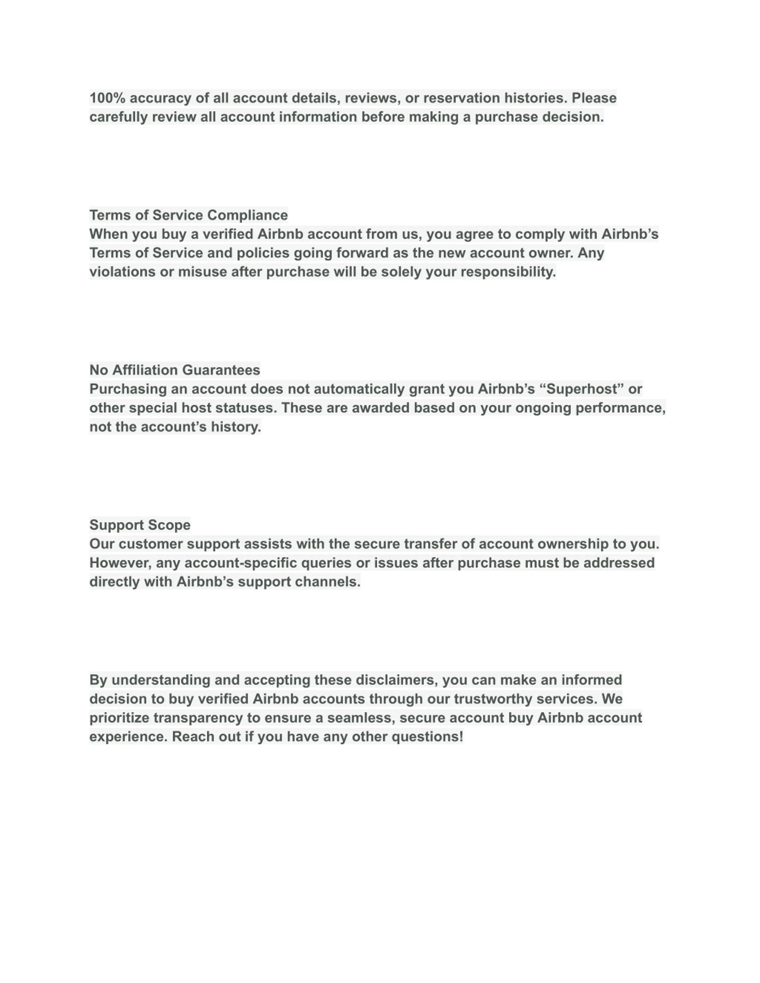 100% accuracy of all account details, reviews, or reservation histories. Please carefully review all account information before making a purchase decision. Terms of Service Compliance When you buy a verified Airbnb account from us, you agree to comply with Airbnb s Terms of Service and policies going forward as the new account owner. Any violations or misuse after purchase will be solely your responsibility. No Affiliation Guarantees Purchasing an account does not automatically grant you Airbnb s Superhost or other special host statuses. These are awarded based on your ongoing performance, not the account s history. Support Scope Our customer support assists with the secure transfer of account ownership to you. However, any account-specific queries or issues after purchase must be addressed directly with Airbnb s support channels. By understanding and accepting these disclaimers, you can make an informed decision to buy verified Airbnb accounts through our trustworthy services. We prioritize transparency to ensure a seamless, secure account buy Airbnb account experience. Reach out if you have any other questions!