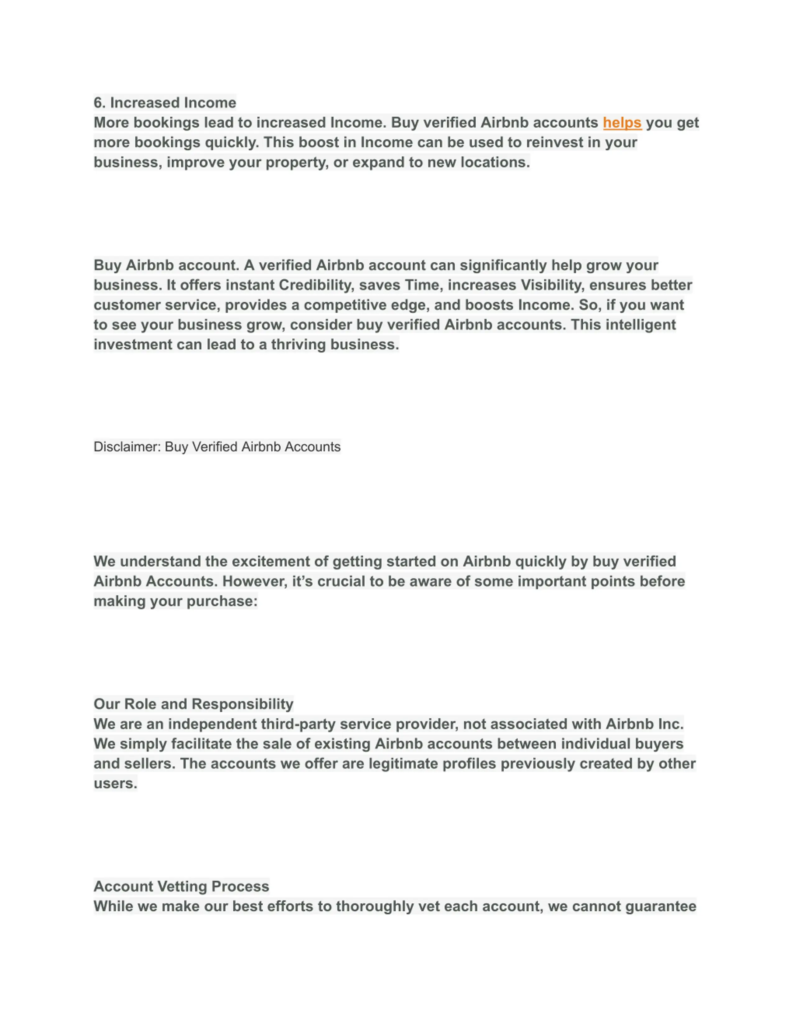 6. Increased Income More bookings lead to increased Income. Buy verified Airbnb accounts helps you get more bookings quickly. This boost in Income can be used to reinvest in your business, improve your property, or expand to new locations. Buy Airbnb account. A verified Airbnb account can significantly help grow your business. It offers instant Credibility, saves Time, increases Visibility, ensures better customer service, provides a competitive edge, and boosts Income. So, if you want to see your business grow, consider buy verified Airbnb accounts. This intelligent investment can lead to a thriving business. Disclaimer: Buy Verified Airbnb Accounts We understand the excitement of getting started on Airbnb quickly by buy verified Airbnb Accounts. However, it s crucial to be aware of some important points before making your purchase: Our Role and Responsibility We are an independent third-party service provider, not associated with Airbnb Inc. We simply facilitate the sale of existing Airbnb accounts between individual buyers and sellers. The accounts we offer are legitimate profiles previously created by other users. Account Vetting Process While we make our best efforts to thoroughly vet each account, we cannot guarantee