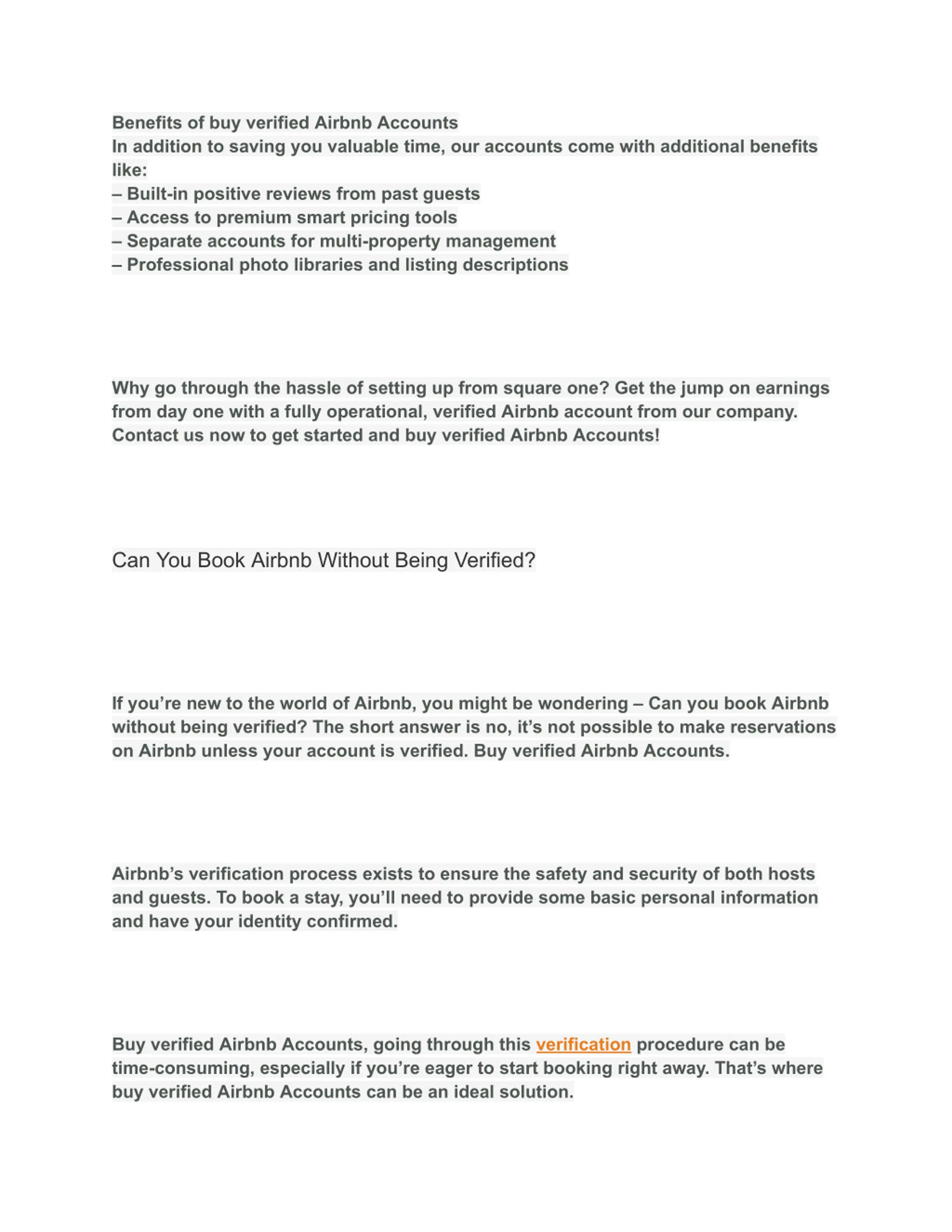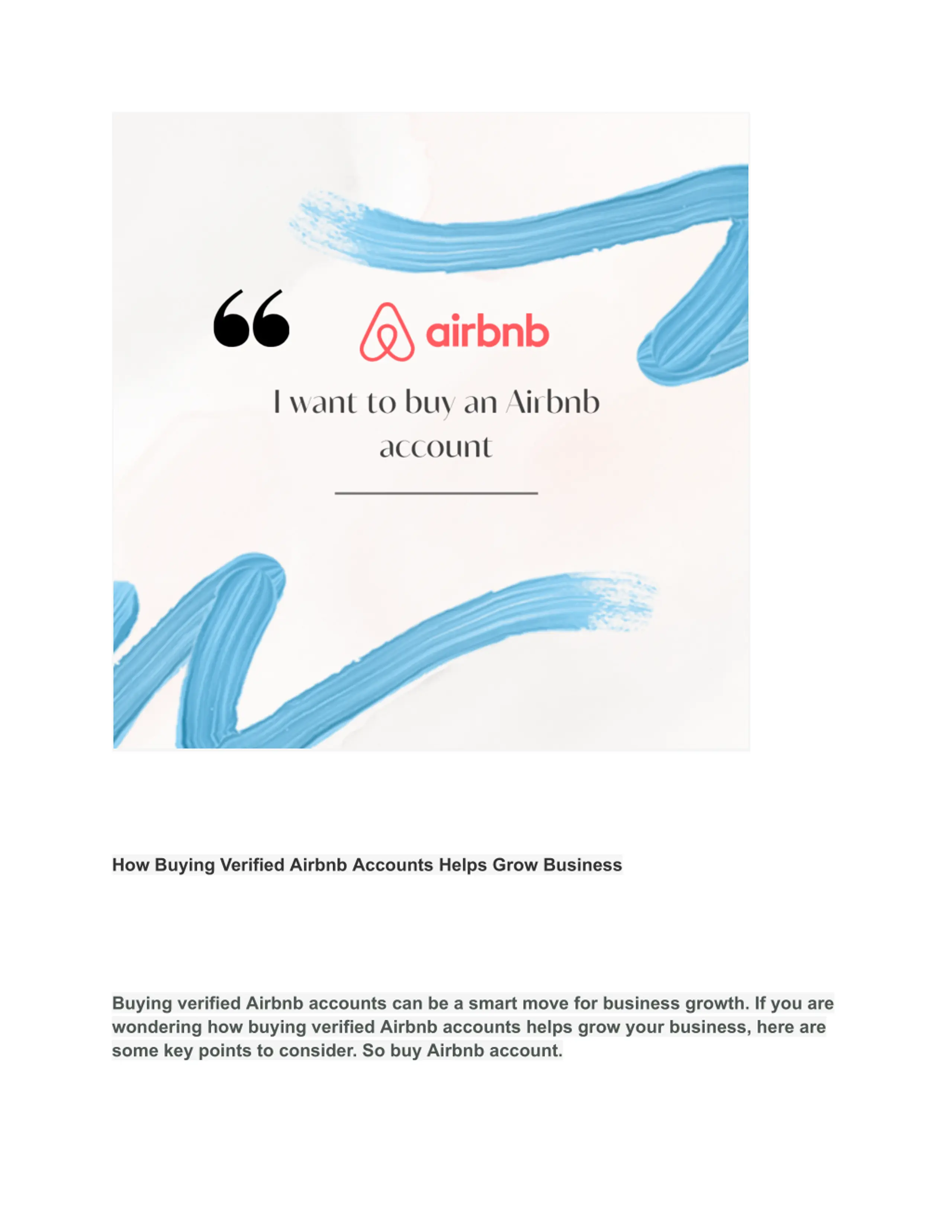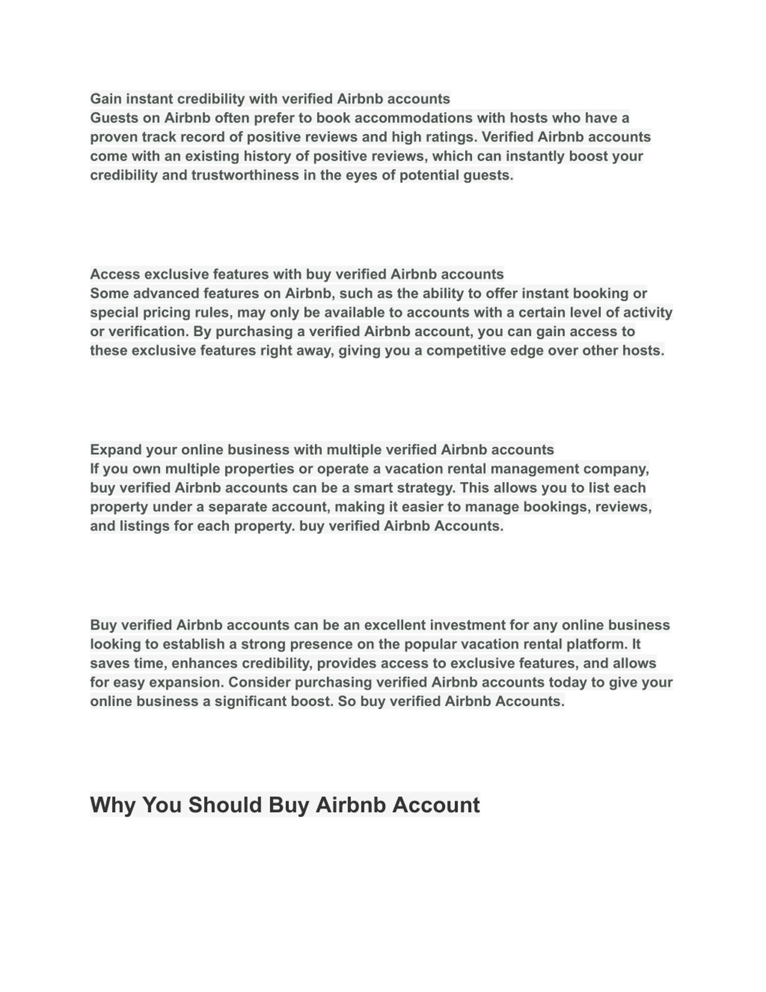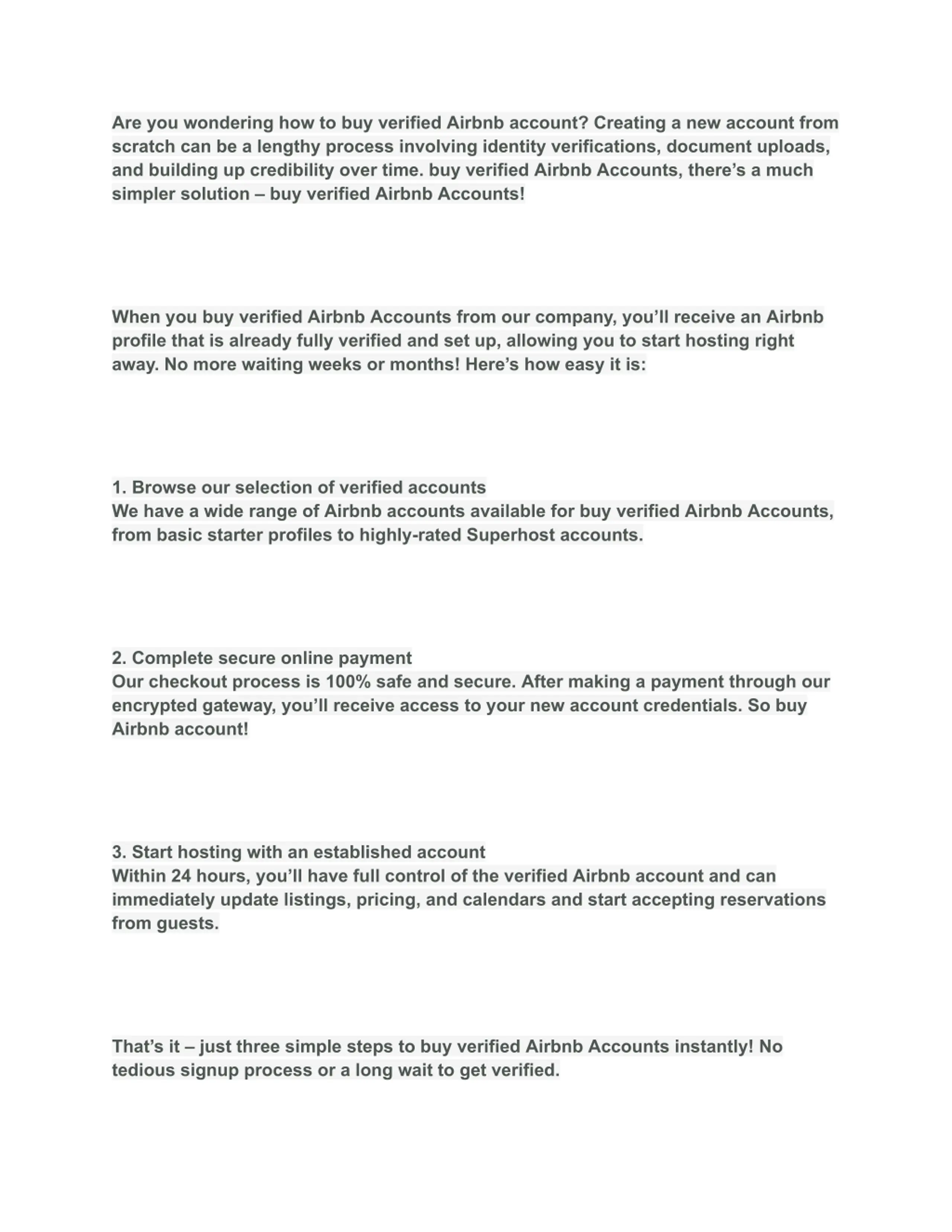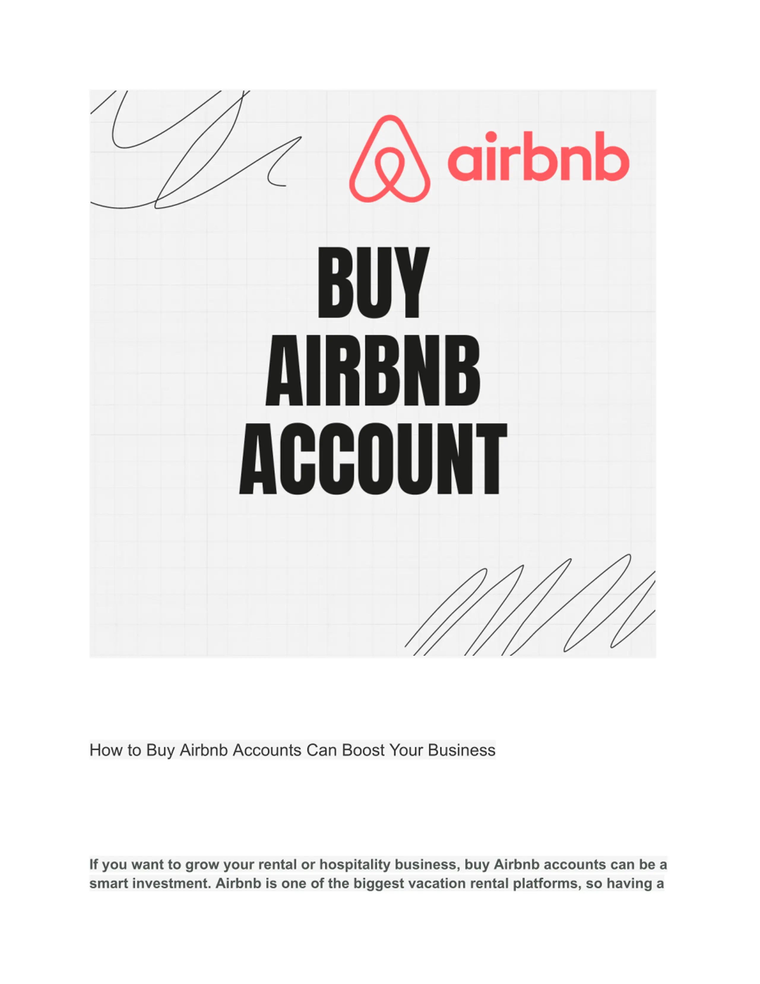 strong presence there is key. Heres how buy Airbnb accounts can take your business to new heights: Jump Start with Credibility New Airbnb hosts often struggle to get their first few bookings because guests prefer experienced hosts with good reviews. But when you buy Airbnb accounts that already have a solid review history, you instantly gain credibility. This makes it easier to attract guests and get bookings right away. So buy verified Airbnb Accounts. Unlock Premium Features Airbnb offers special premium features like instant booking and custom pricing tools. However, these are usually only available to seasoned superhosts. By buy Airbnb accounts, you unlock these powerful features from day one, giving you an edge over competitors. Separate Properties Easily If you have multiple rental properties, managing everything under one Airbnb account can be messy. Buy Airbnb accounts allows you to neatly separate each listing, making organization and tracking much simpler as your business expands. Bypass Time-Consuming Setup Uploading documents, proving your identity, and setting up payments are all necessary steps in setting up an Airbnb account. This procedure may require weeks. Buy Airbnb accounts that are already fully verified and set up saves valuable time and effort. So buy verified Airbnb Accounts.