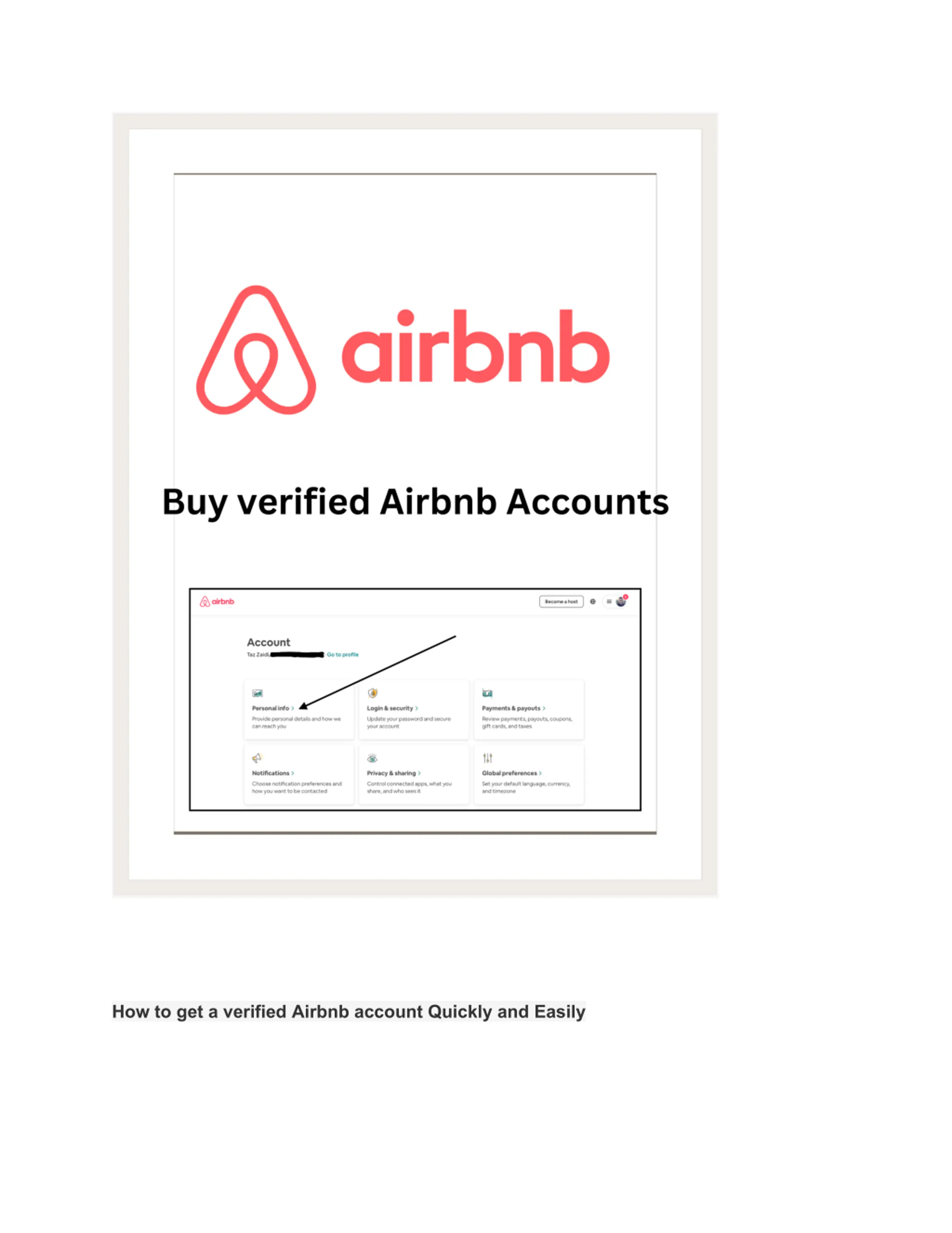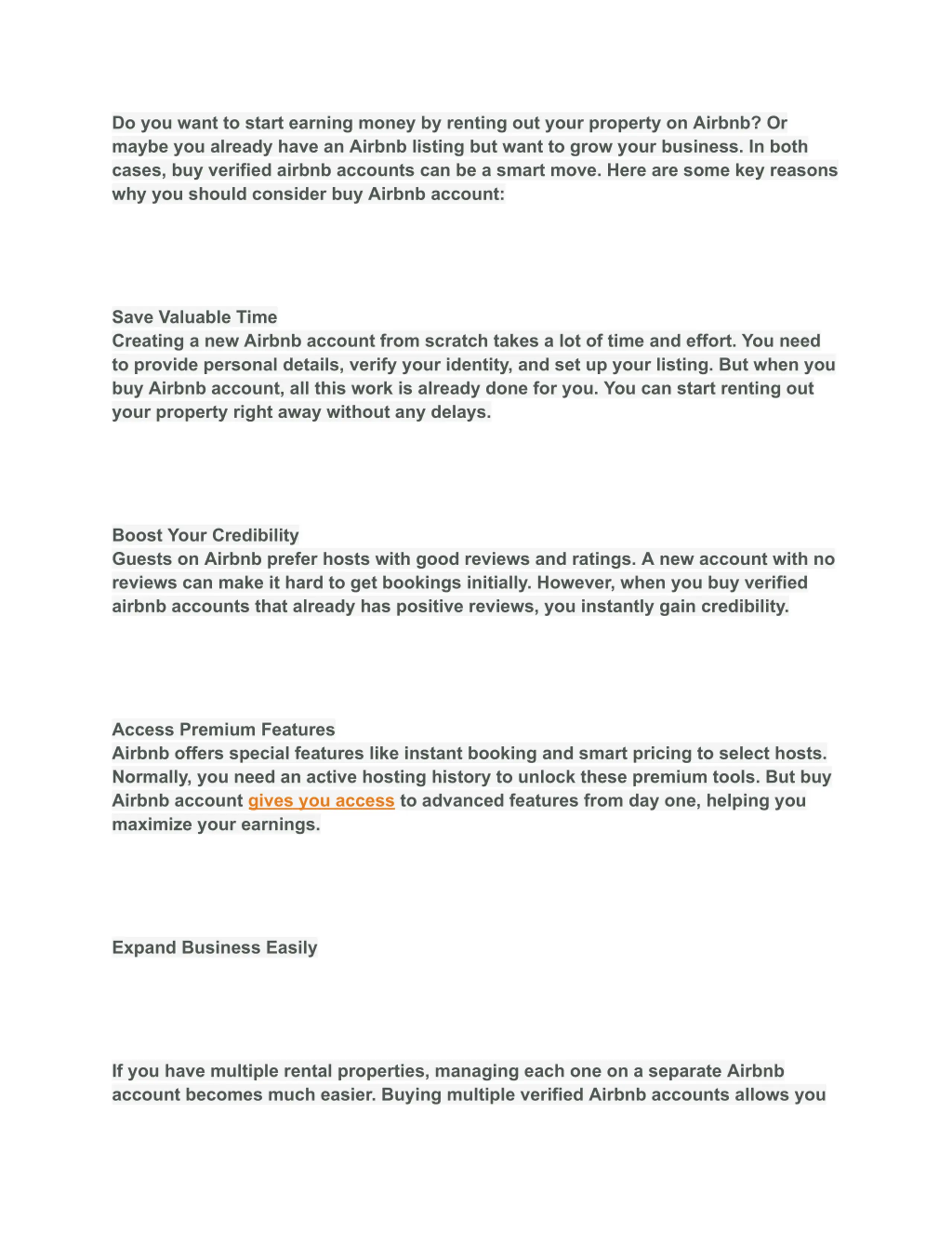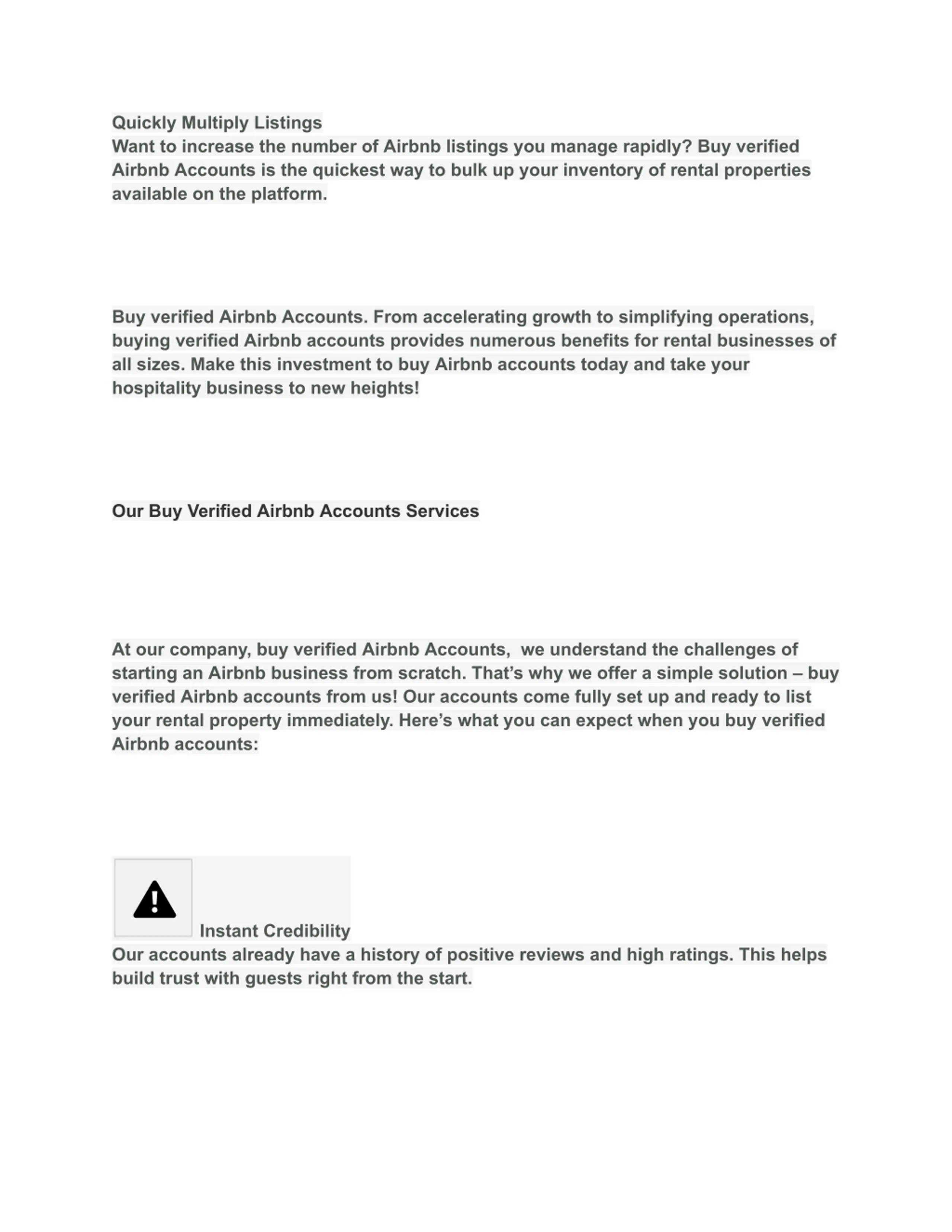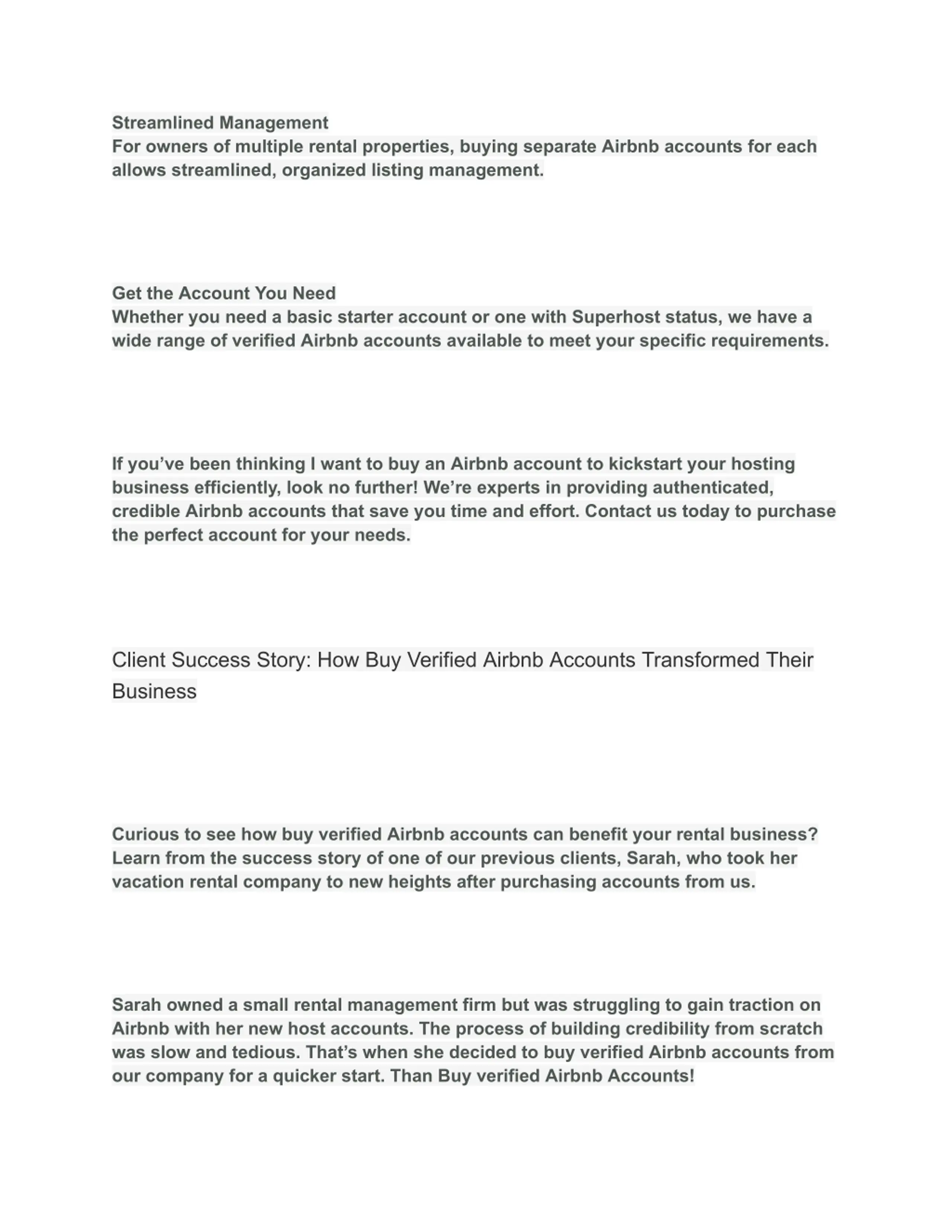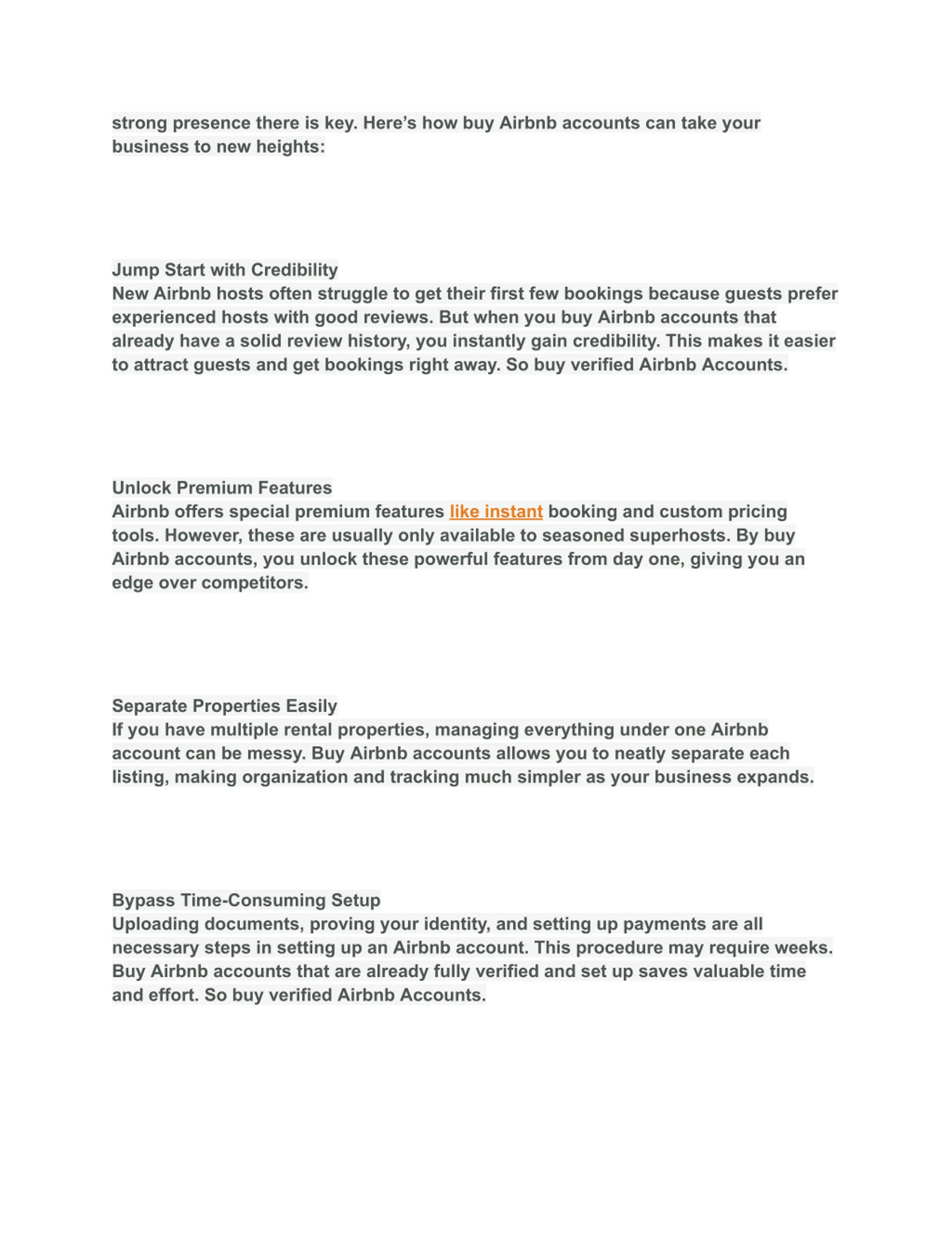 strong presence there is key. Heres how buy Airbnb accounts can take your business to new heights: Jump Start with Credibility New Airbnb hosts often struggle to get their first few bookings because guests prefer experienced hosts with good reviews. But when you buy Airbnb accounts that already have a solid review history, you instantly gain credibility. This makes it easier to attract guests and get bookings right away. So buy verified Airbnb Accounts. Unlock Premium Features Airbnb offers special premium features like instant booking and custom pricing tools. However, these are usually only available to seasoned superhosts. By buy Airbnb accounts, you unlock these powerful features from day one, giving you an edge over competitors. Separate Properties Easily If you have multiple rental properties, managing everything under one Airbnb account can be messy. Buy Airbnb accounts allows you to neatly separate each listing, making organization and tracking much simpler as your business expands. Bypass Time-Consuming Setup Uploading documents, proving your identity, and setting up payments are all necessary steps in setting up an Airbnb account. This procedure may require weeks. Buy Airbnb accounts that are already fully verified and set up saves valuable time and effort. So buy verified Airbnb Accounts.
