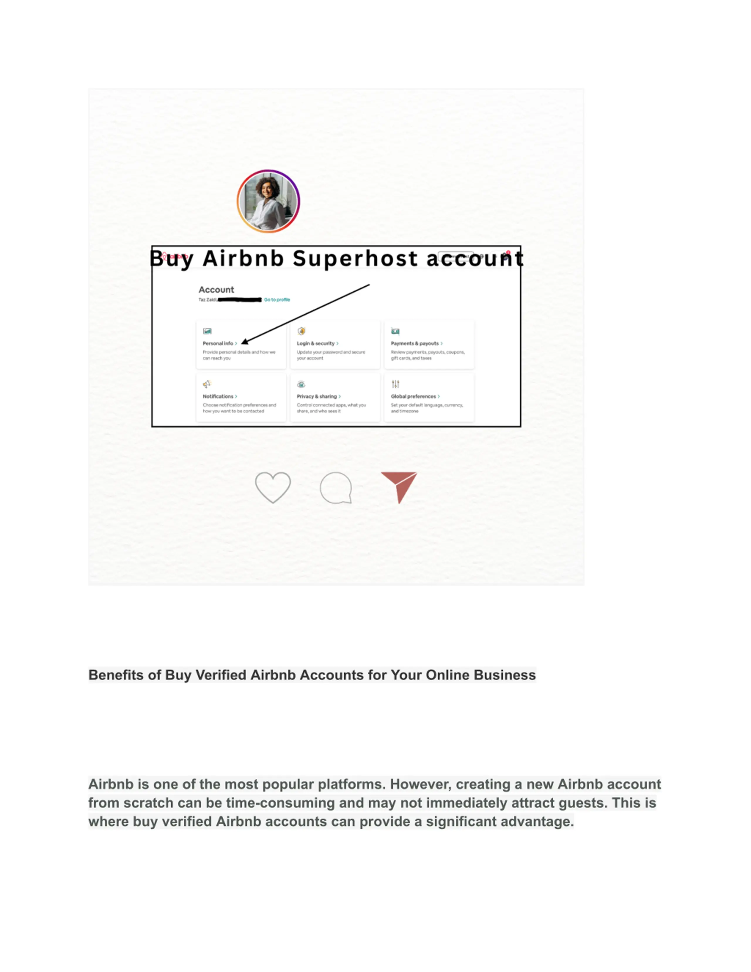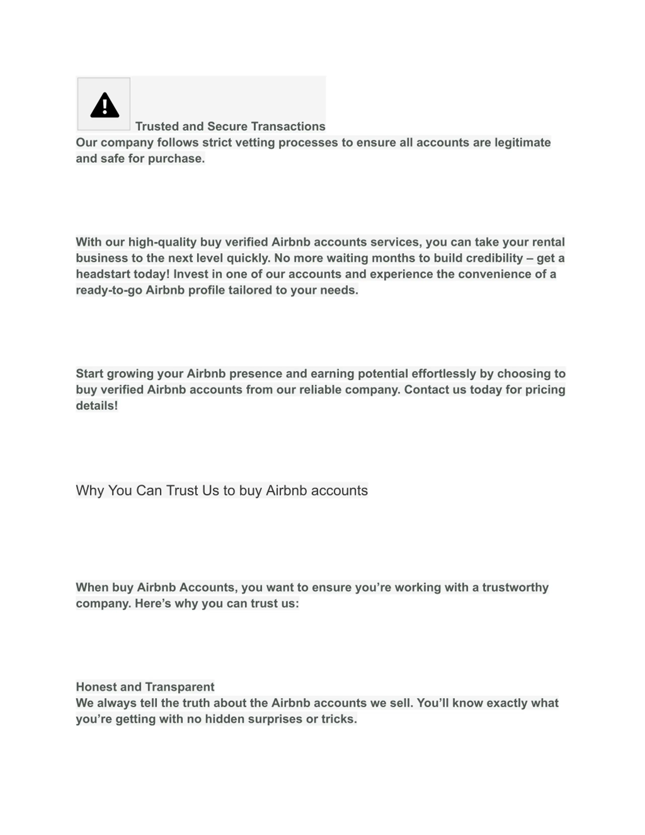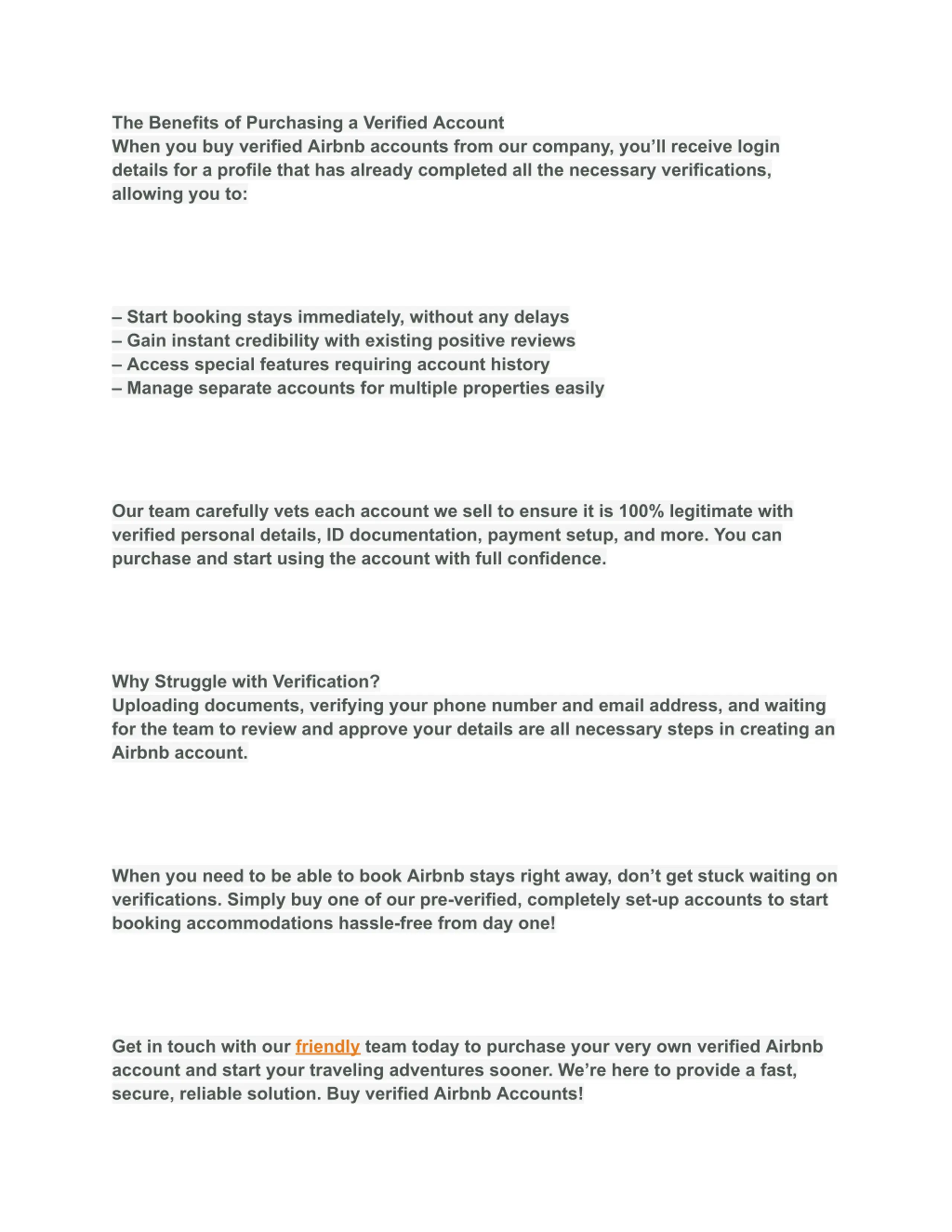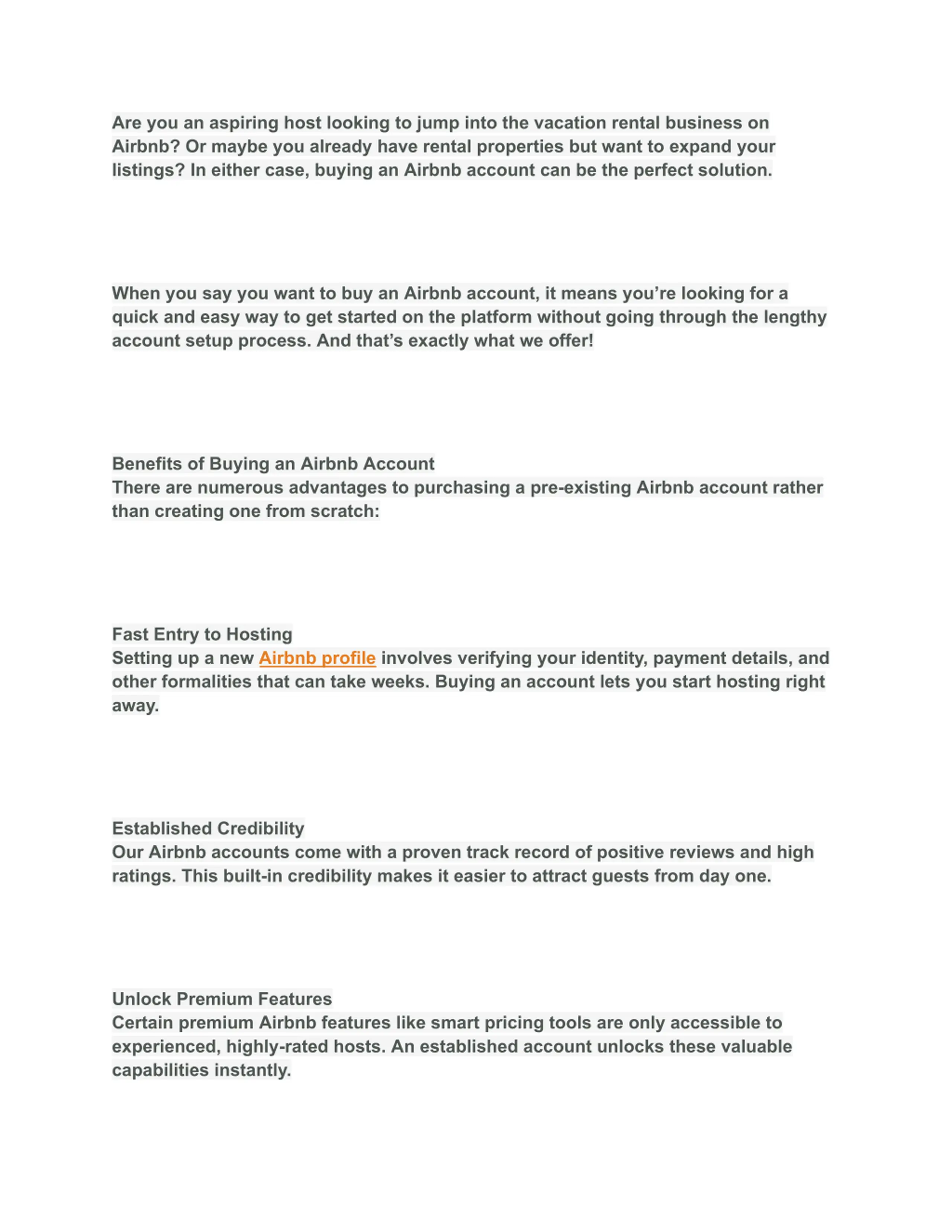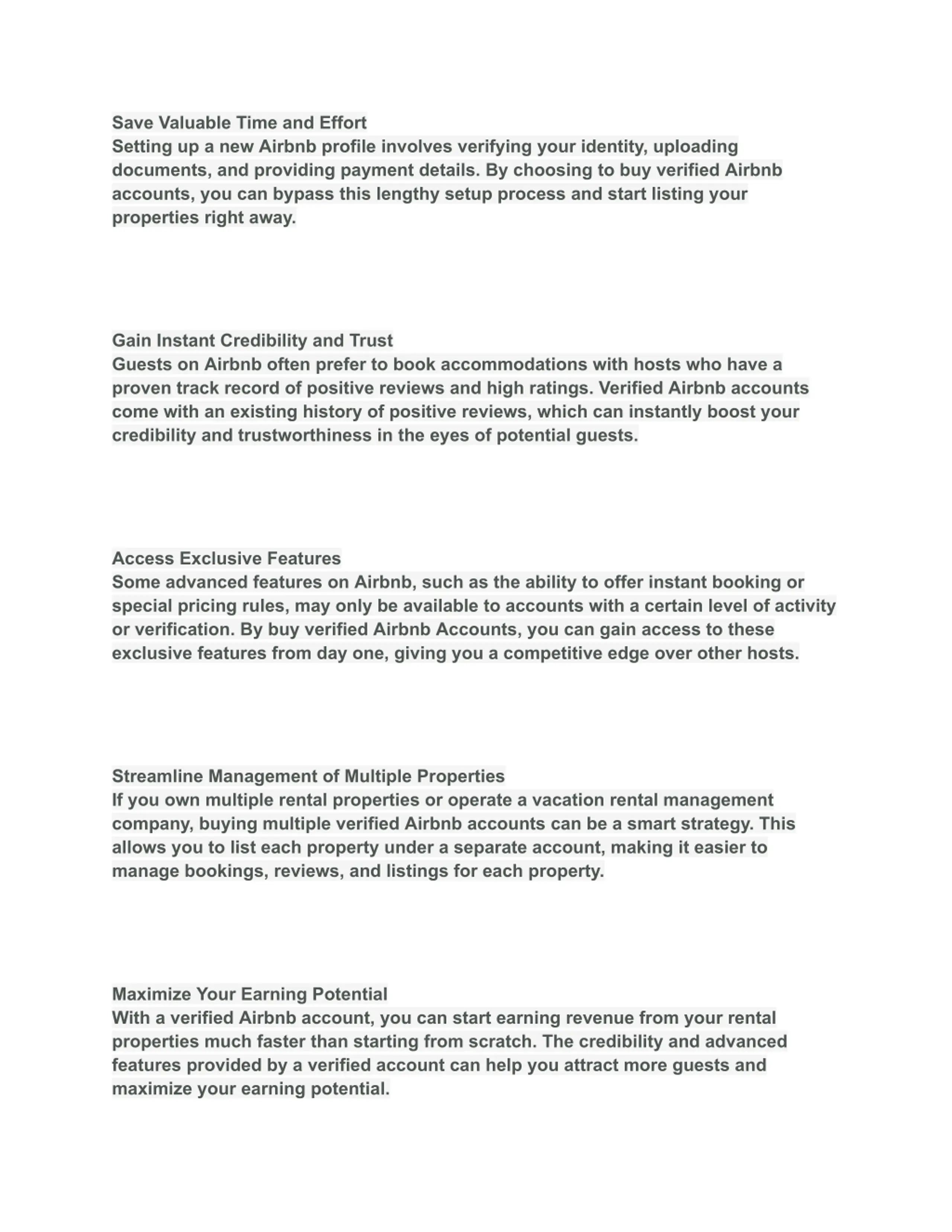 strong presence there is key. Heres how buy Airbnb accounts can take your business to new heights: Jump Start with Credibility New Airbnb hosts often struggle to get their first few bookings because guests prefer experienced hosts with good reviews. But when you buy Airbnb accounts that already have a solid review history, you instantly gain credibility. This makes it easier to attract guests and get bookings right away. So buy verified Airbnb Accounts. Unlock Premium Features Airbnb offers special premium features like instant booking and custom pricing tools. However, these are usually only available to seasoned superhosts. By buy Airbnb accounts, you unlock these powerful features from day one, giving you an edge over competitors. Separate Properties Easily If you have multiple rental properties, managing everything under one Airbnb account can be messy. Buy Airbnb accounts allows you to neatly separate each listing, making organization and tracking much simpler as your business expands. Bypass Time-Consuming Setup Uploading documents, proving your identity, and setting up payments are all necessary steps in setting up an Airbnb account. This procedure may require weeks. Buy Airbnb accounts that are already fully verified and set up saves valuable time and effort. So buy verified Airbnb Accounts.
