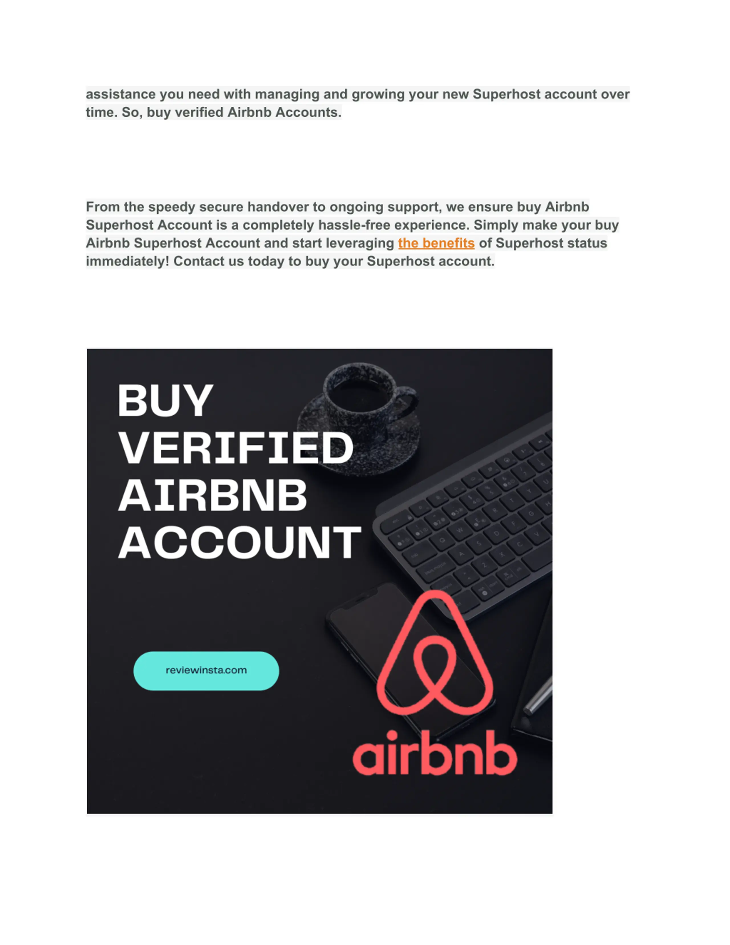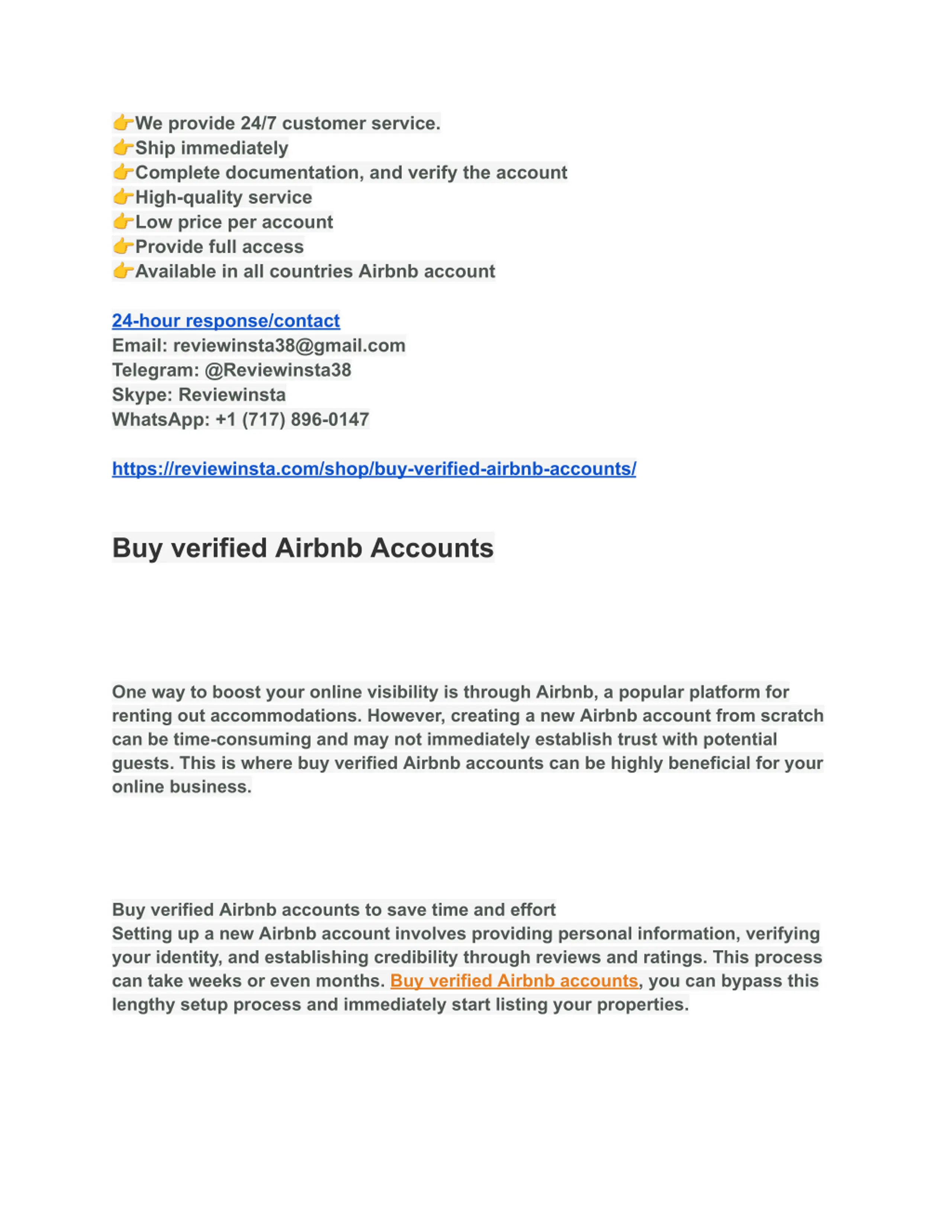 ?We provide 24/7 customer service. ?Ship immediately ?Complete documentation, and verify the account ?High-quality service ?Low price per account ?Provide full access ?Available in all countries Airbnb account 24-hour response/contact Email: reviewinsta38@gmail.com Telegram: @Reviewinsta38 Skype: Reviewinsta WhatsApp: +1 (717) 896-0147 https://reviewinsta.com/shop/buy-verified-airbnb-accounts/ Buy verified Airbnb Accounts One way to boost your online visibility is through Airbnb, a popular platform for renting out accommodations. However, creating a new Airbnb account from scratch can be time-consuming and may not immediately establish trust with potential guests. This is where buy verified Airbnb accounts can be highly beneficial for your online business. Buy verified Airbnb accounts to save time and effort Setting up a new Airbnb account involves providing personal information, verifying your identity, and establishing credibility through reviews and ratings. This process can take weeks or even months. Buy verified Airbnb accounts, you can bypass this lengthy setup process and immediately start listing your properties.