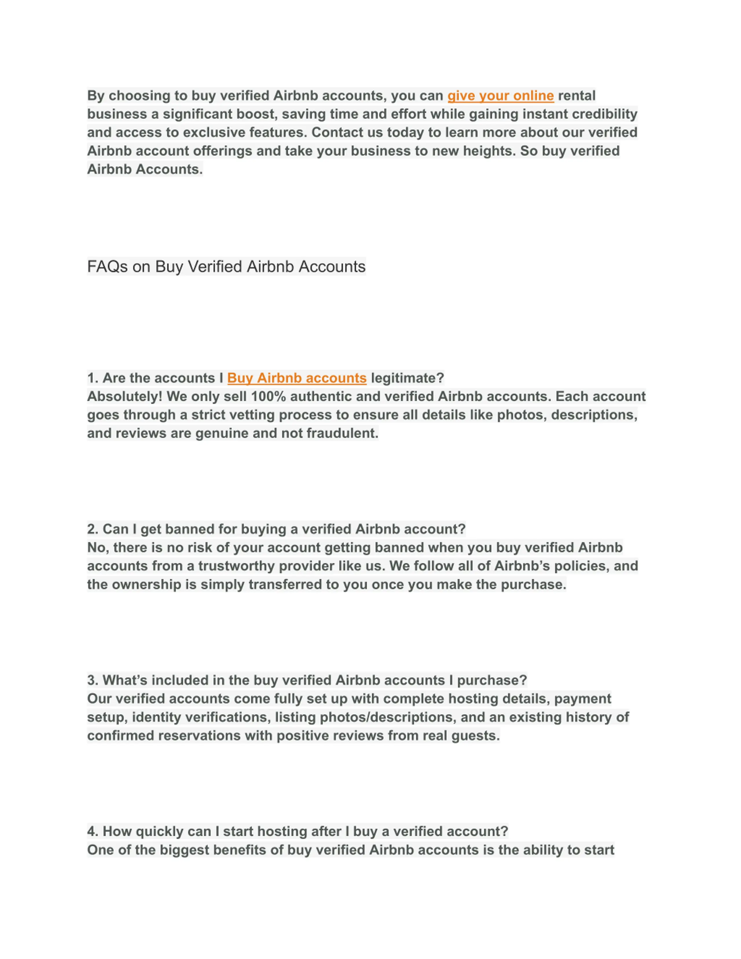 By choosing to buy verified Airbnb accounts, you can give your online rental business a significant boost, saving time and effort while gaining instant credibility and access to exclusive features. Contact us today to learn more about our verified Airbnb account offerings and take your business to new heights. So buy verified Airbnb Accounts. FAQs on Buy Verified Airbnb Accounts 1. Are the accounts I Buy Airbnb accounts legitimate? Absolutely! We only sell 100% authentic and verified Airbnb accounts. Each account goes through a strict vetting process to ensure all details like photos, descriptions, and reviews are genuine and not fraudulent. 2. Can I get banned for buying a verified Airbnb account? No, there is no risk of your account getting banned when you buy verified Airbnb accounts from a trustworthy provider like us. We follow all of Airbnb s policies, and the ownership is simply transferred to you once you make the purchase. 3. What s included in the buy verified Airbnb accounts I purchase? Our verified accounts come fully set up with complete hosting details, payment setup, identity verifications, listing photos/descriptions, and an existing history of confirmed reservations with positive reviews from real guests. 4. How quickly can I start hosting after I buy a verified account? One of the biggest benefits of buy verified Airbnb accounts is the ability to start