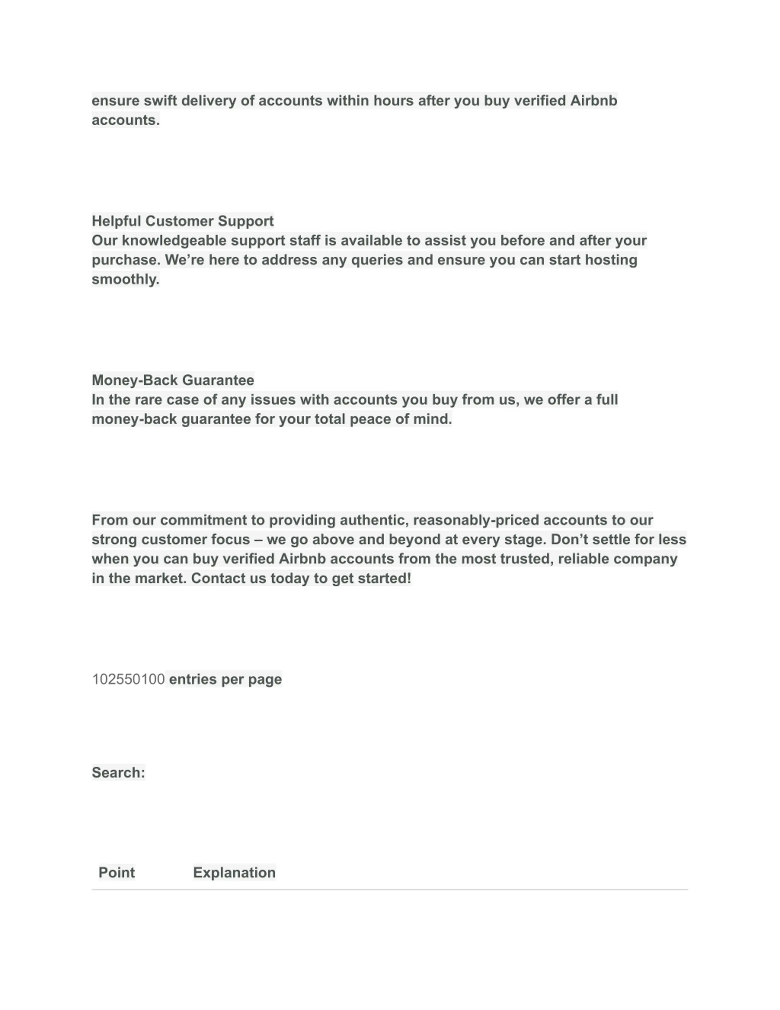 ensure swift delivery of accounts within hours after you buy verified Airbnb accounts. Helpful Customer Support Our knowledgeable support staff is available to assist you before and after your purchase. We re here to address any queries and ensure you can start hosting smoothly. Money-Back Guarantee In the rare case of any issues with accounts you buy from us, we offer a full money-back guarantee for your total peace of mind. From our commitment to providing authentic, reasonably-priced accounts to our strong customer focus we go above and beyond at every stage. Don t settle for less when you can buy verified Airbnb accounts from the most trusted, reliable company in the market. Contact us today to get started! 102550100 entries per page Search: Point Explanation