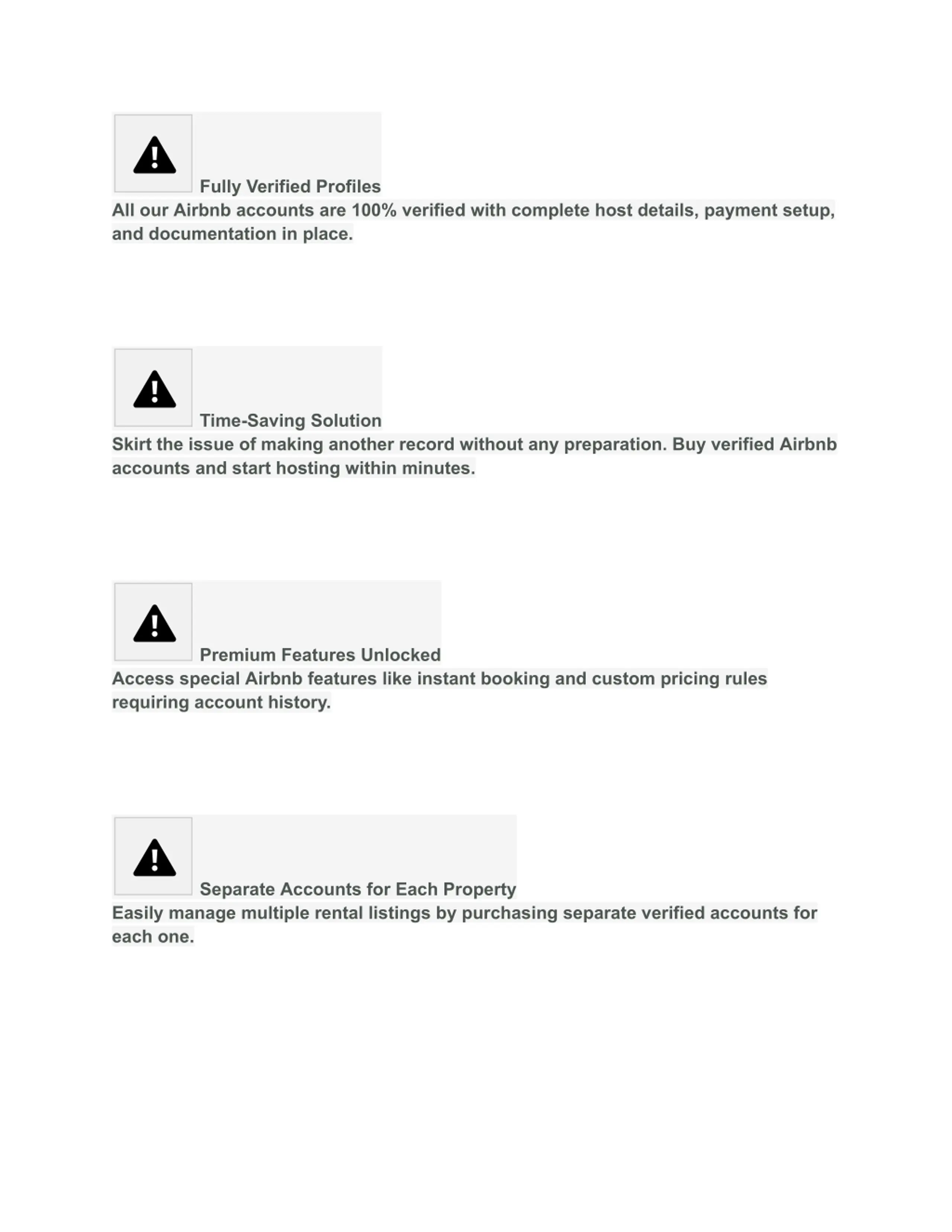 Fully Verified Profiles All our Airbnb accounts are 100% verified with complete host details, payment setup, and documentation in place. Time-Saving Solution Skirt the issue of making another record without any preparation. Buy verified Airbnb accounts and start hosting within minutes. Premium Features Unlocked Access special Airbnb features like instant booking and custom pricing rules requiring account history. Separate Accounts for Each Property Easily manage multiple rental listings by purchasing separate verified accounts for each one.