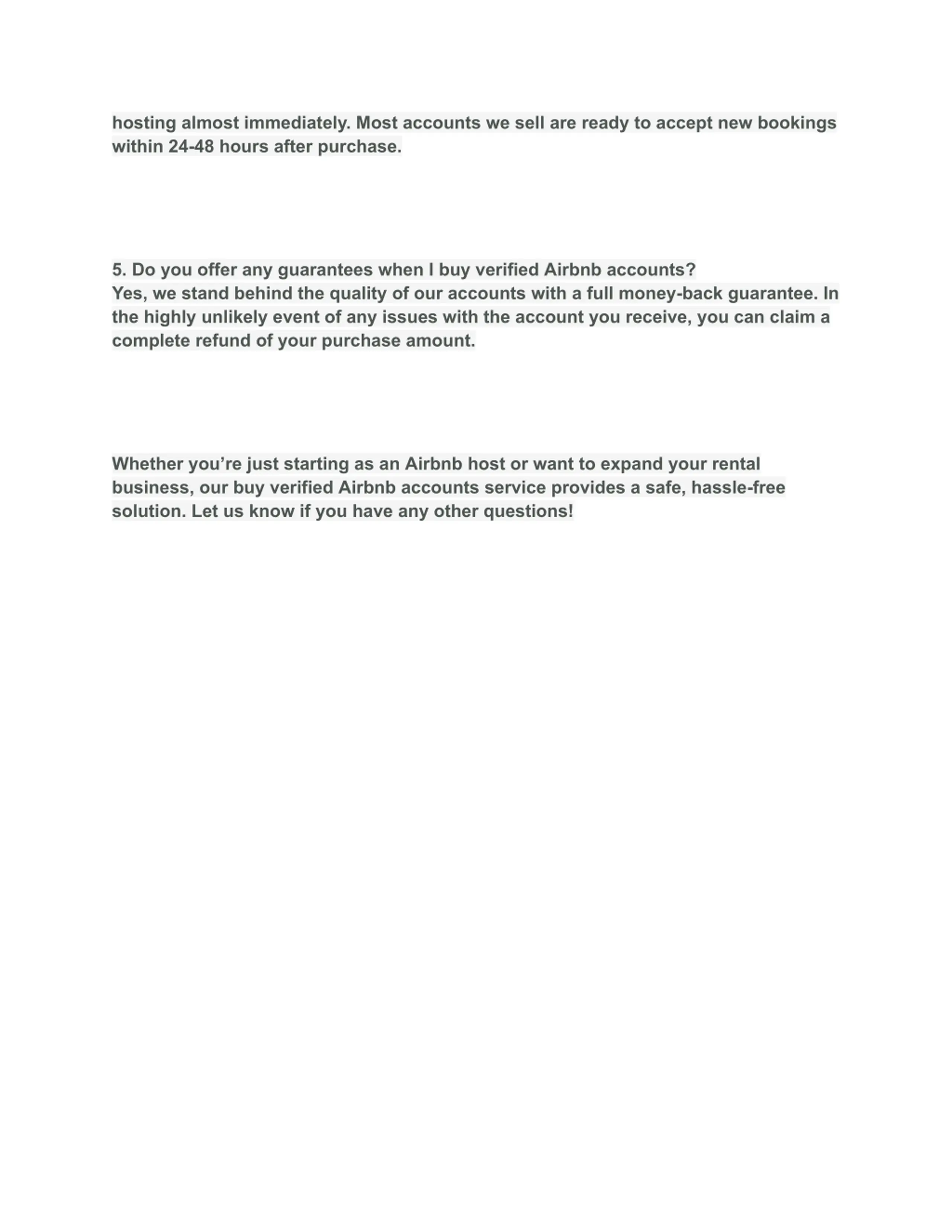 hosting almost immediately. Most accounts we sell are ready to accept new bookings within 24-48 hours after purchase. 5. Do you offer any guarantees when I buy verified Airbnb accounts? Yes, we stand behind the quality of our accounts with a full money-back guarantee. In the highly unlikely event of any issues with the account you receive, you can claim a complete refund of your purchase amount. Whether you re just starting as an Airbnb host or want to expand your rental business, our buy verified Airbnb accounts service provides a safe, hassle-free solution. Let us know if you have any other questions!