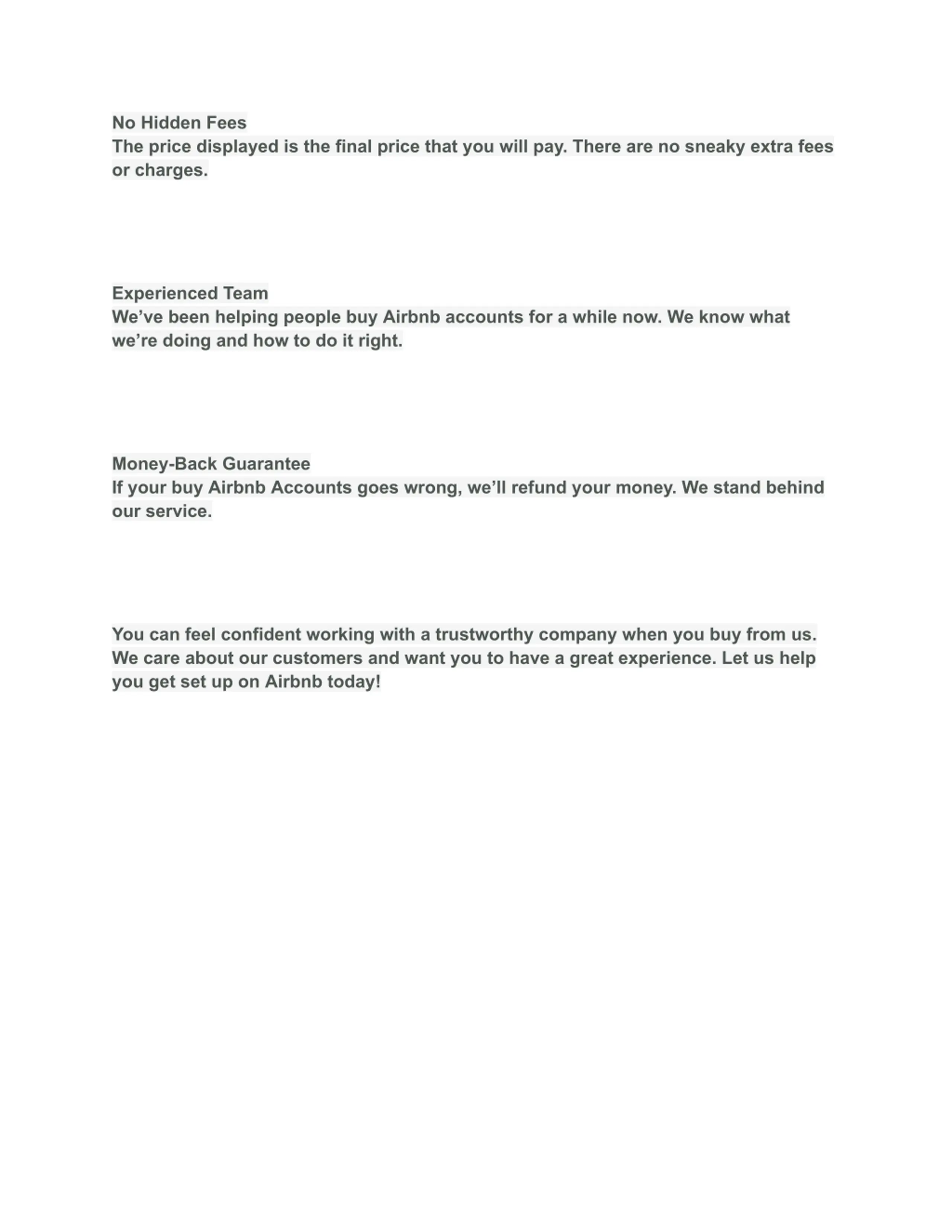 No Hidden Fees The price displayed is the final price that you will pay. There are no sneaky extra fees or charges. Experienced Team We ve been helping people buy Airbnb accounts for a while now. We know what we re doing and how to do it right. Money-Back Guarantee If your buy Airbnb Accounts goes wrong, we ll refund your money. We stand behind our service. You can feel confident working with a trustworthy company when you buy from us. We care about our customers and want you to have a great experience. Let us help you get set up on Airbnb today!