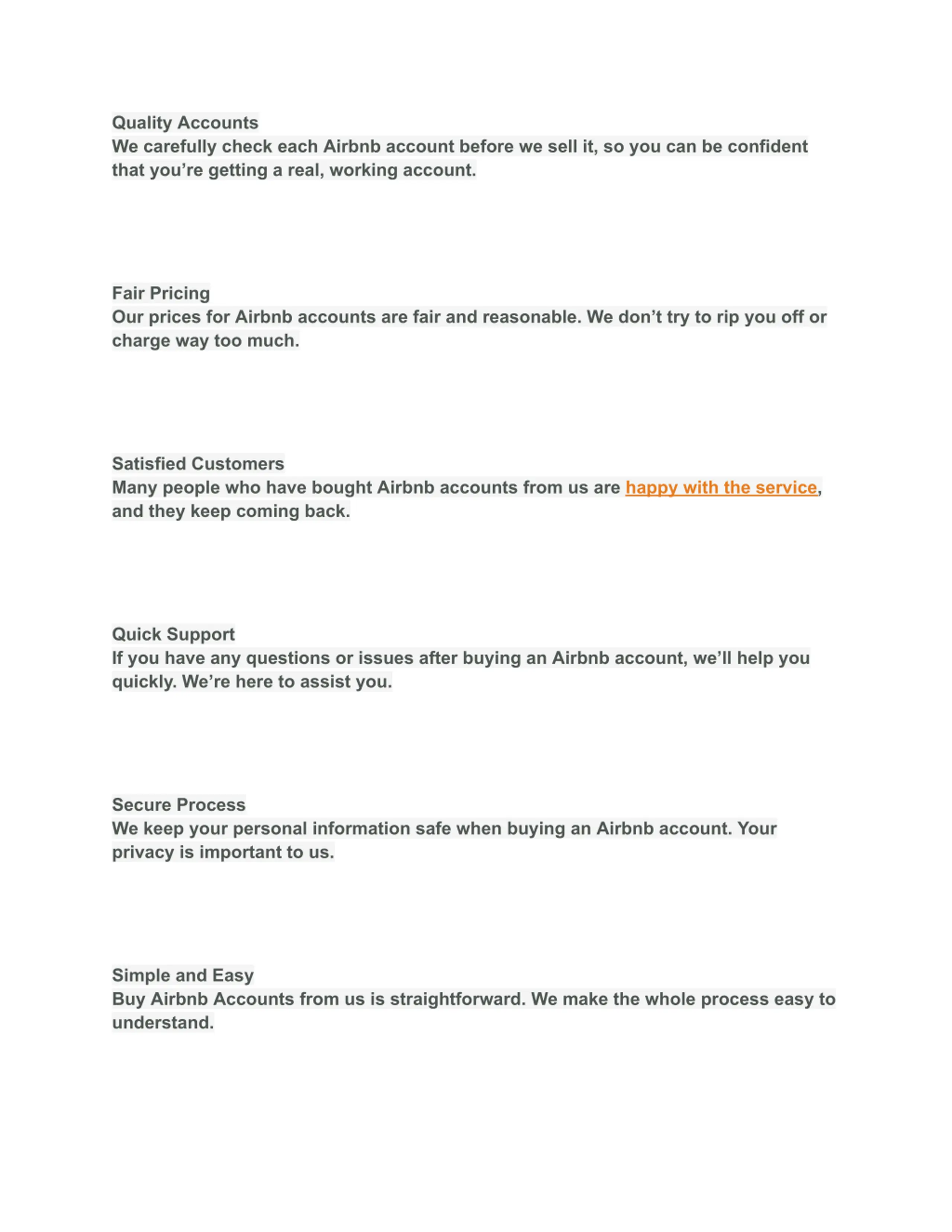 Quality Accounts We carefully check each Airbnb account before we sell it, so you can be confident that you re getting a real, working account. Fair Pricing Our prices for Airbnb accounts are fair and reasonable. We don t try to rip you off or charge way too much. Satisfied Customers Many people who have bought Airbnb accounts from us are happy with the service, and they keep coming back. Quick Support If you have any questions or issues after buying an Airbnb account, we ll help you quickly. We re here to assist you. Secure Process We keep your personal information safe when buying an Airbnb account. Your privacy is important to us. Simple and Easy Buy Airbnb Accounts from us is straightforward. We make the whole process easy to understand.
