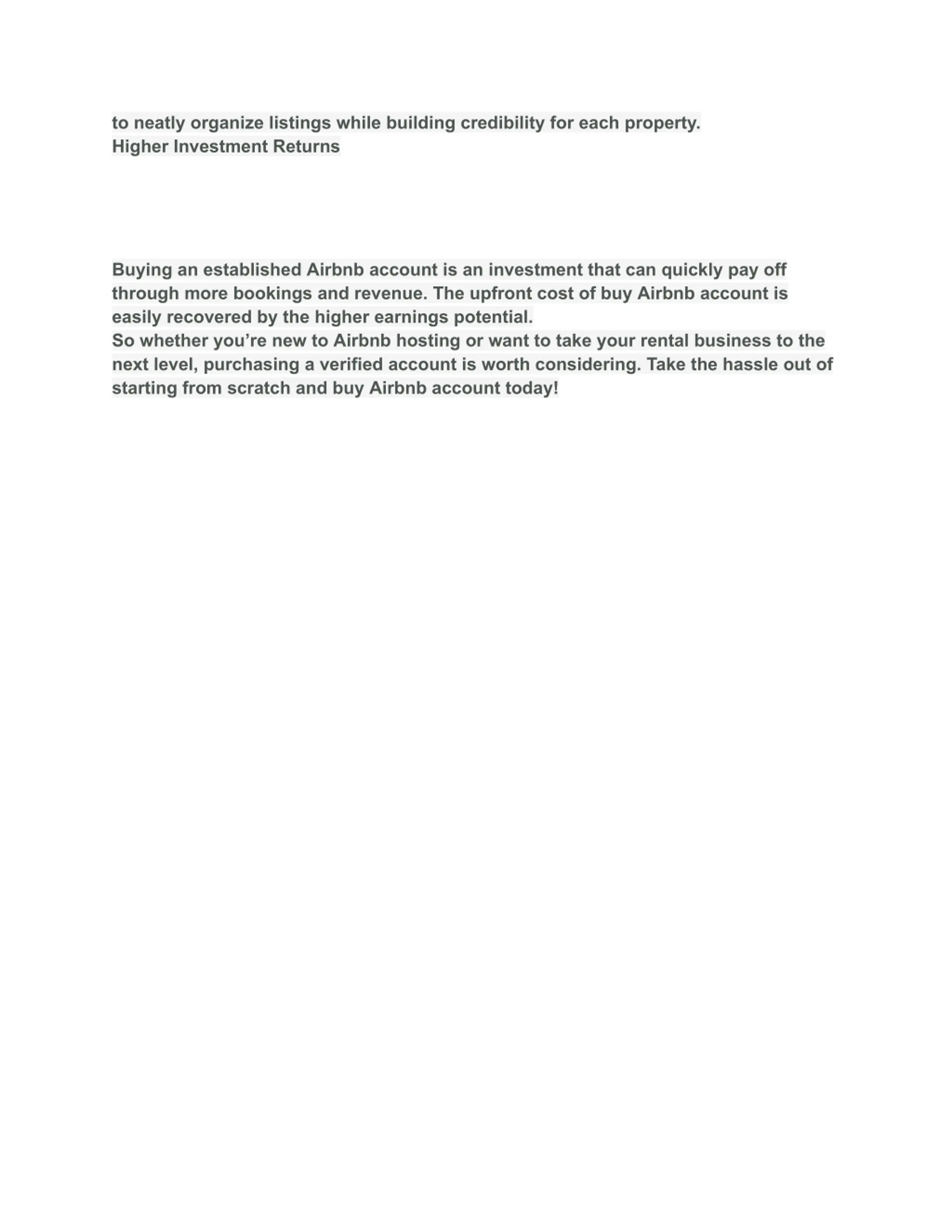 to neatly organize listings while building credibility for each property. Higher Investment Returns Buying an established Airbnb account is an investment that can quickly pay off through more bookings and revenue. The upfront cost of buy Airbnb account is easily recovered by the higher earnings potential. So whether you re new to Airbnb hosting or want to take your rental business to the next level, purchasing a verified account is worth considering. Take the hassle out of starting from scratch and buy Airbnb account today!