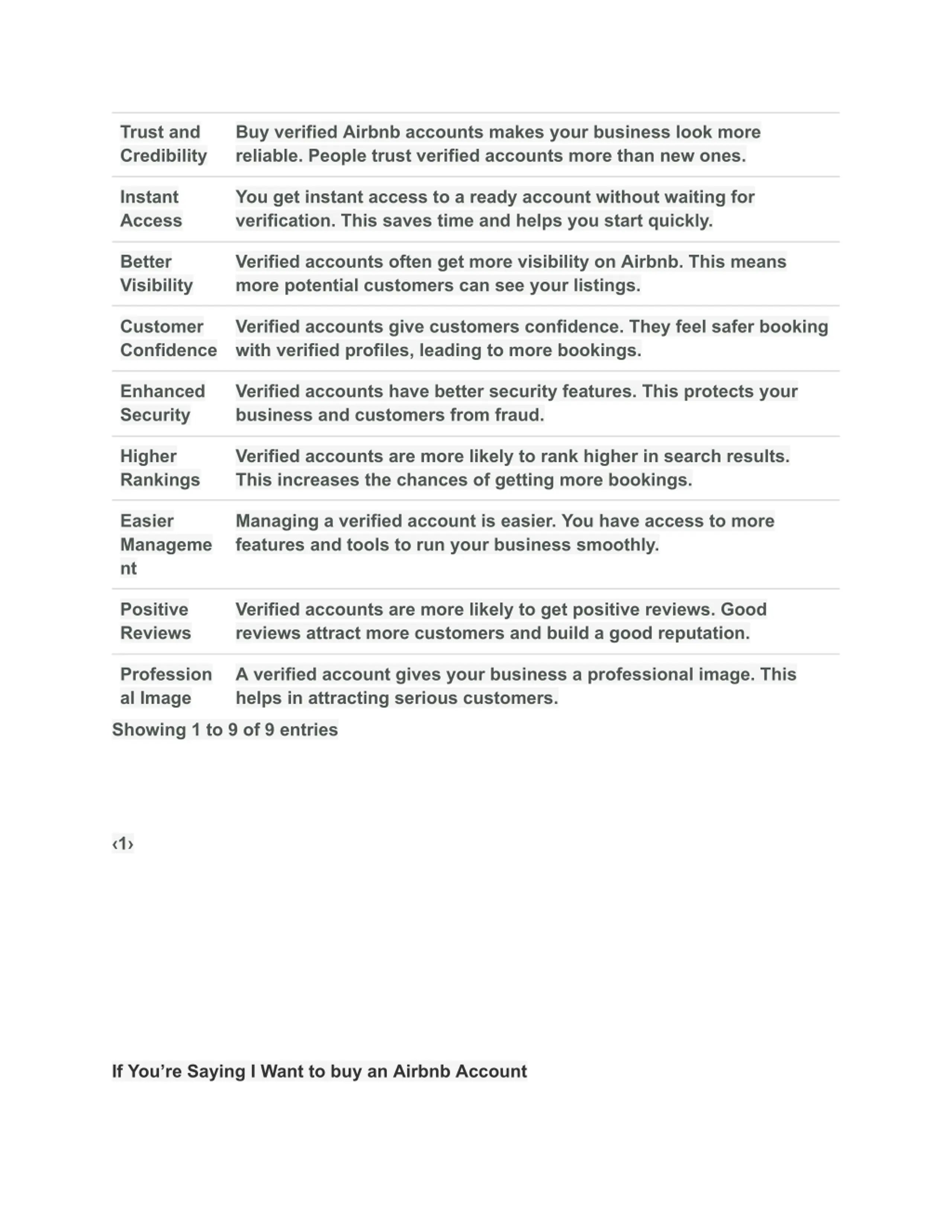 Trust and Credibility Buy verified Airbnb accounts makes your business look more reliable. People trust verified accounts more than new ones. Instant Access You get instant access to a ready account without waiting for verification. This saves time and helps you start quickly. Better Visibility Verified accounts often get more visibility on Airbnb. This means more potential customers can see your listings. Customer Confidence Verified accounts give customers confidence. They feel safer booking with verified profiles, leading to more bookings. Enhanced Security Verified accounts have better security features. This protects your business and customers from fraud. Higher Rankings Verified accounts are more likely to rank higher in search results. This increases the chances of getting more bookings. Easier Manageme nt Managing a verified account is easier. You have access to more features and tools to run your business smoothly. Positive Reviews Verified accounts are more likely to get positive reviews. Good reviews attract more customers and build a good reputation. Profession al Image A verified account gives your business a professional image. This helps in attracting serious customers. Showing 1 to 9 of 9 entries 1 If You re Saying I Want to buy an Airbnb Account