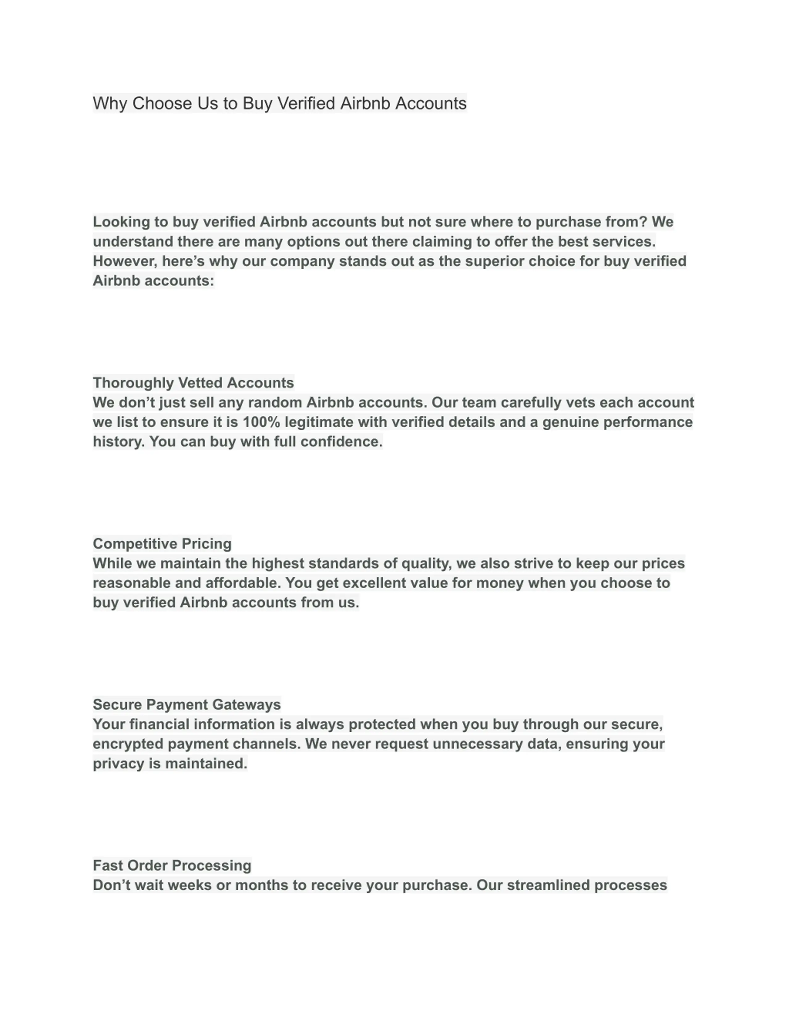 Why Choose Us to Buy Verified Airbnb Accounts Looking to buy verified Airbnb accounts but not sure where to purchase from? We understand there are many options out there claiming to offer the best services. However, here s why our company stands out as the superior choice for buy verified Airbnb accounts: Thoroughly Vetted Accounts We don t just sell any random Airbnb accounts. Our team carefully vets each account we list to ensure it is 100% legitimate with verified details and a genuine performance history. You can buy with full confidence. Competitive Pricing While we maintain the highest standards of quality, we also strive to keep our prices reasonable and affordable. You get excellent value for money when you choose to buy verified Airbnb accounts from us. Secure Payment Gateways Your financial information is always protected when you buy through our secure, encrypted payment channels. We never request unnecessary data, ensuring your privacy is maintained. Fast Order Processing Don t wait weeks or months to receive your purchase. Our streamlined processes