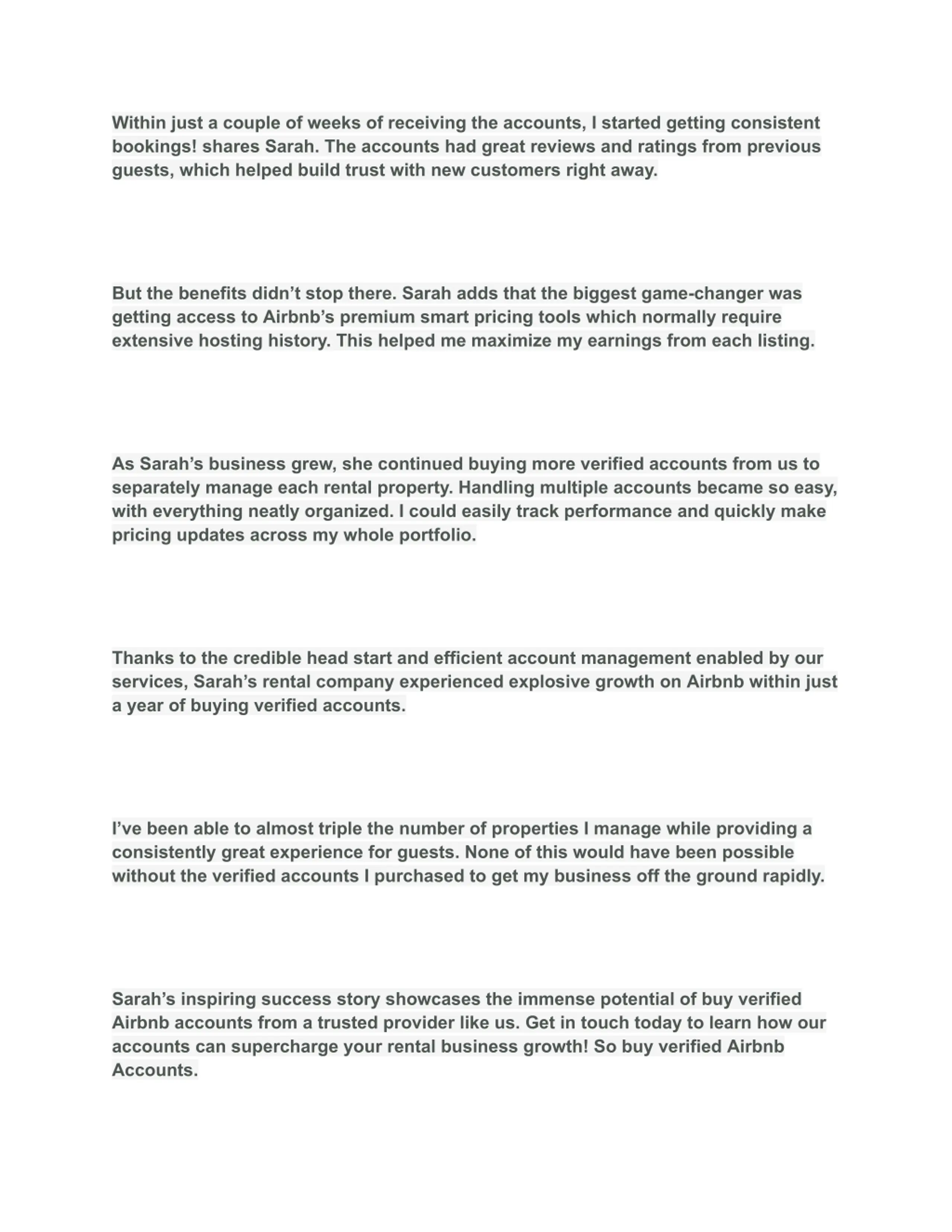 Within just a couple of weeks of receiving the accounts, I started getting consistent bookings! shares Sarah. The accounts had great reviews and ratings from previous guests, which helped build trust with new customers right away. But the benefits didn t stop there. Sarah adds that the biggest game-changer was getting access to Airbnb s premium smart pricing tools which normally require extensive hosting history. This helped me maximize my earnings from each listing. As Sarah s business grew, she continued buying more verified accounts from us to separately manage each rental property. Handling multiple accounts became so easy, with everything neatly organized. I could easily track performance and quickly make pricing updates across my whole portfolio. Thanks to the credible head start and efficient account management enabled by our services, Sarah s rental company experienced explosive growth on Airbnb within just a year of buying verified accounts. I ve been able to almost triple the number of properties I manage while providing a consistently great experience for guests. None of this would have been possible without the verified accounts I purchased to get my business off the ground rapidly. Sarah s inspiring success story showcases the immense potential of buy verified Airbnb accounts from a trusted provider like us. Get in touch today to learn how our accounts can supercharge your rental business growth! So buy verified Airbnb Accounts.