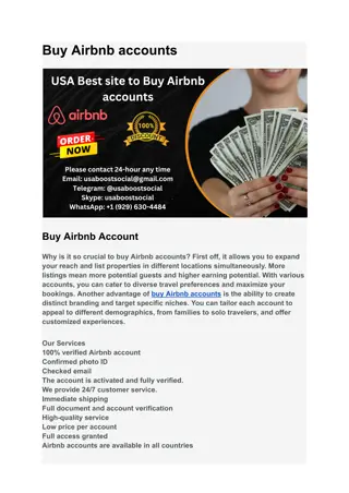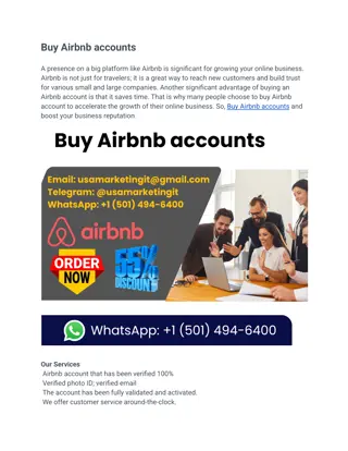 strong presence there is key. Heres how buy Airbnb accounts can take your business to new heights: Jump Start with Credibility New Airbnb hosts often struggle to get their first few bookings because guests prefer experienced hosts with good reviews. But when you buy Airbnb accounts that already have a solid review history, you instantly gain credibility. This makes it easier to attract guests and get bookings right away. So buy verified Airbnb Accounts. Unlock Premium Features Airbnb offers special premium features like instant booking and custom pricing tools. However, these are usually only available to seasoned superhosts. By buy Airbnb accounts, you unlock these powerful features from day one, giving you an edge over competitors. Separate Properties Easily If you have multiple rental properties, managing everything under one Airbnb account can be messy. Buy Airbnb accounts allows you to neatly separate each listing, making organization and tracking much simpler as your business expands. Bypass Time-Consuming Setup Uploading documents, proving your identity, and setting up payments are all necessary steps in setting up an Airbnb account. This procedure may require weeks. Buy Airbnb accounts that are already fully verified and set up saves valuable time and effort. So buy verified Airbnb Accounts.
