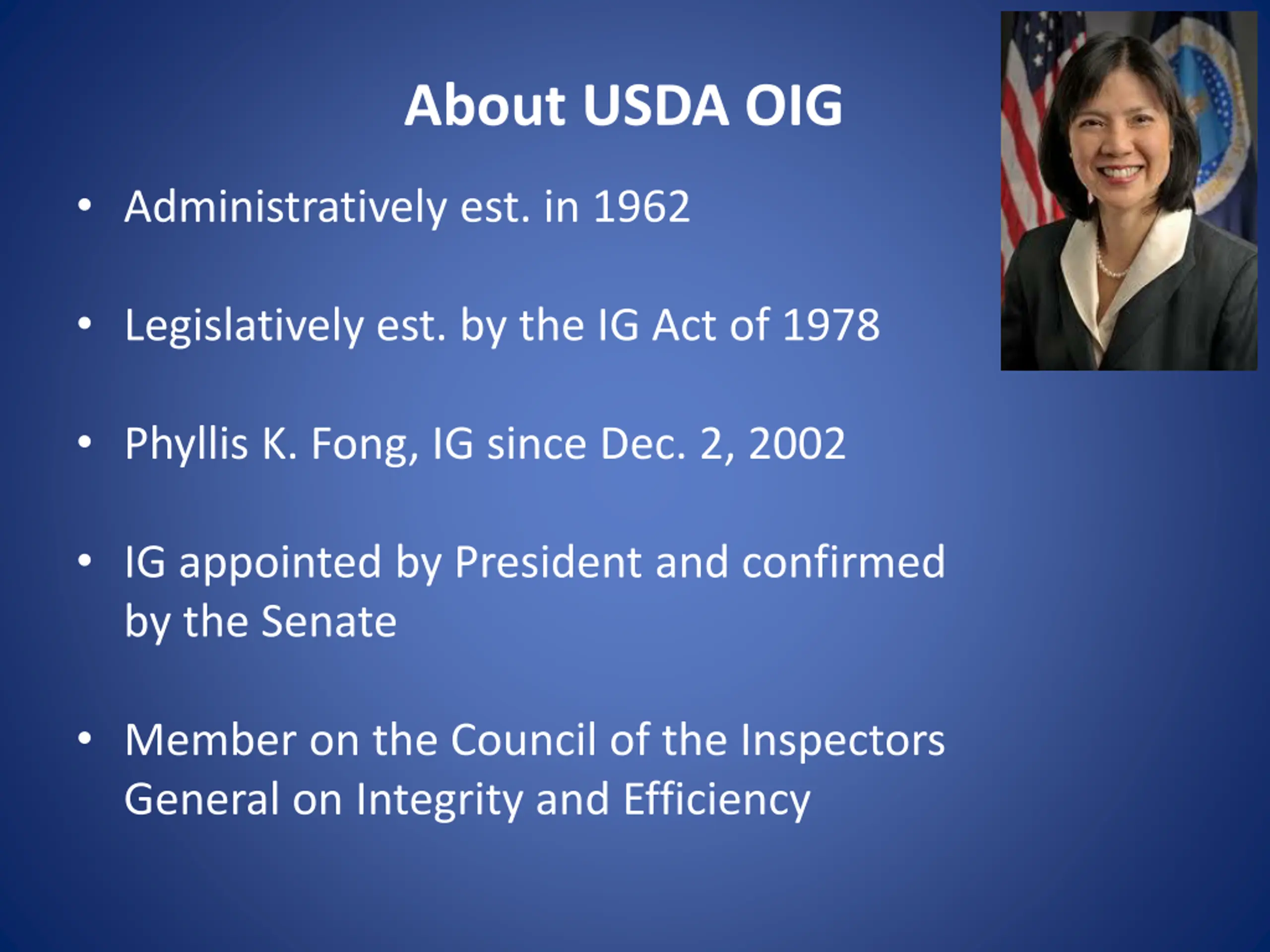 About USDA OIG Administratively est. in 1962 Legislatively est. by the IG Act of 1978 Phyllis K. Fong, IG since Dec. 2, 2002 IG appointed by President and confirmed by the Senate Member on the Council of the Inspectors General on Integrity and Efficiency