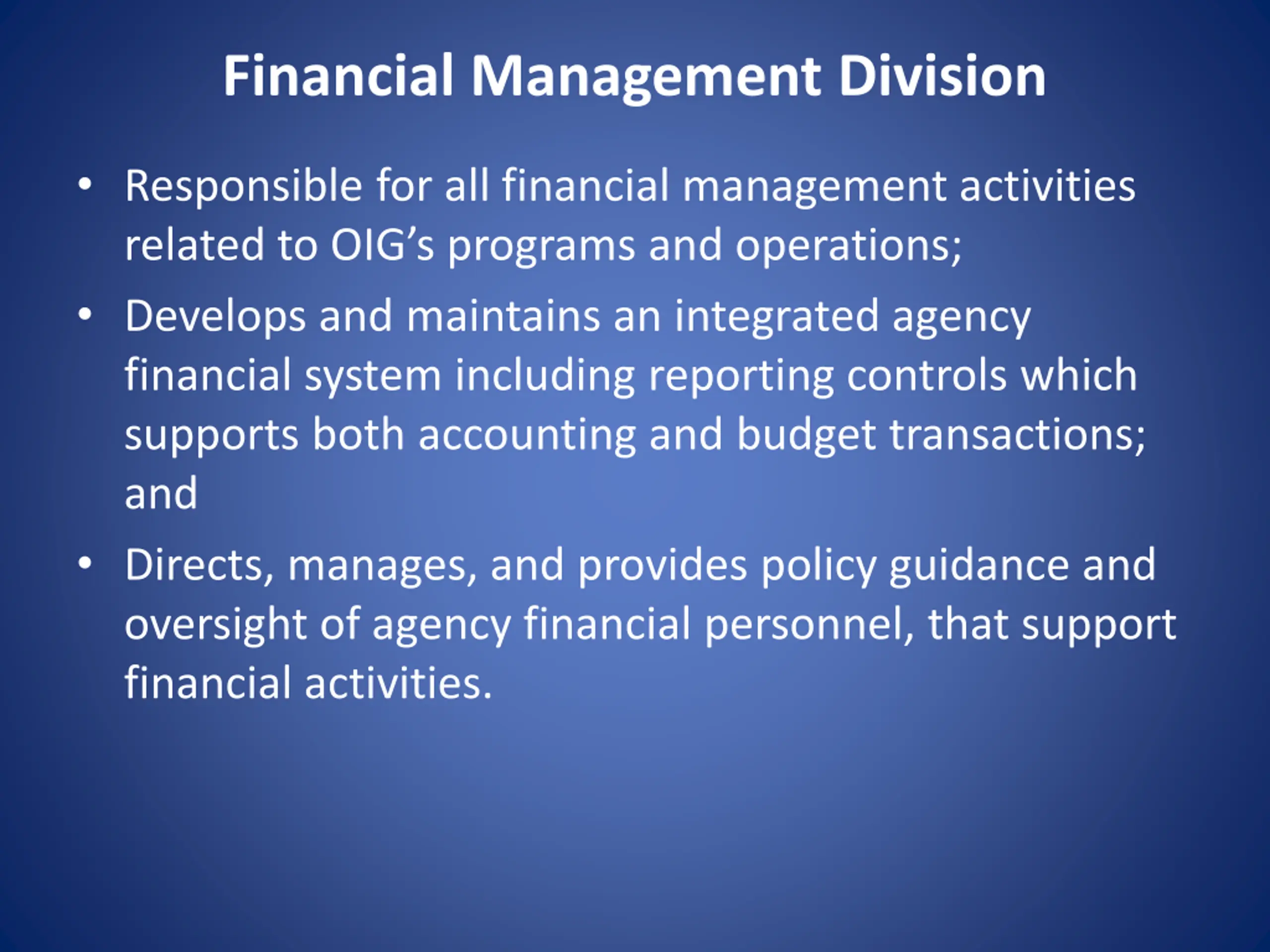 Financial Management Division Responsible for all financial management activities related to OIG s programs and operations; Develops and maintains an integrated agency financial system including reporting controls which supports both accounting and budget transactions; and Directs, manages, and provides policy guidance and oversight of agency financial personnel, that support financial activities.