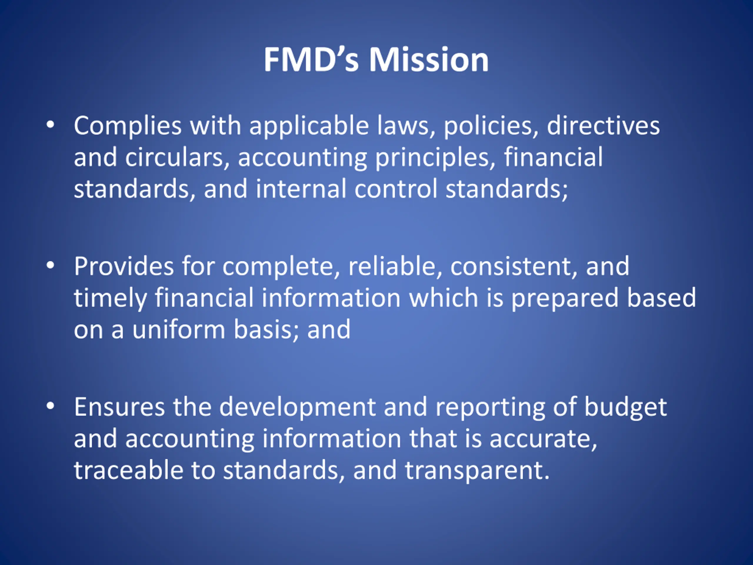 FMDs Mission Complies with applicable laws, policies, directives and circulars, accounting principles, financial standards, and internal control standards; Provides for complete, reliable, consistent, and timely financial information which is prepared based on a uniform basis; and Ensures the development and reporting of budget and accounting information that is accurate, traceable to standards, and transparent.