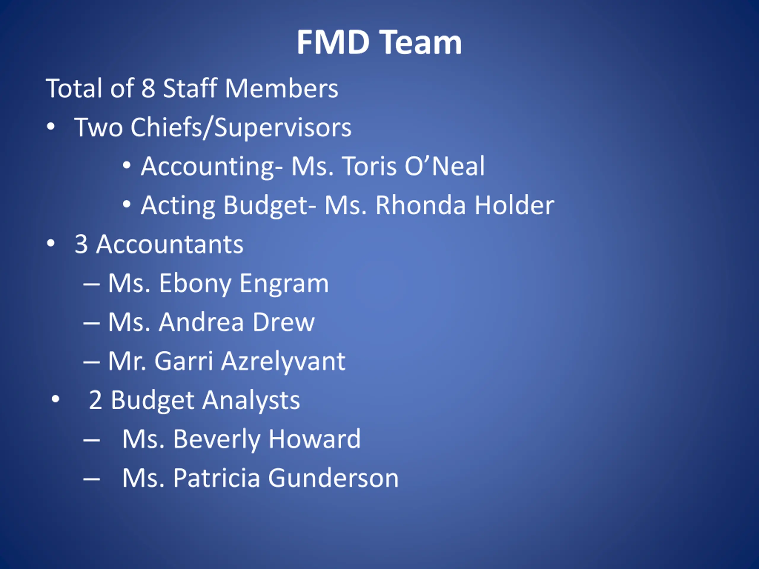 FMD Team Total of 8 Staff Members Two Chiefs/Supervisors Accounting- Ms. Toris O Neal Acting Budget- Ms. Rhonda Holder 3 Accountants Ms. Ebony Engram Ms. Andrea Drew Mr. Garri Azrelyvant 2 Budget Analysts Ms. Beverly Howard Ms. Patricia Gunderson