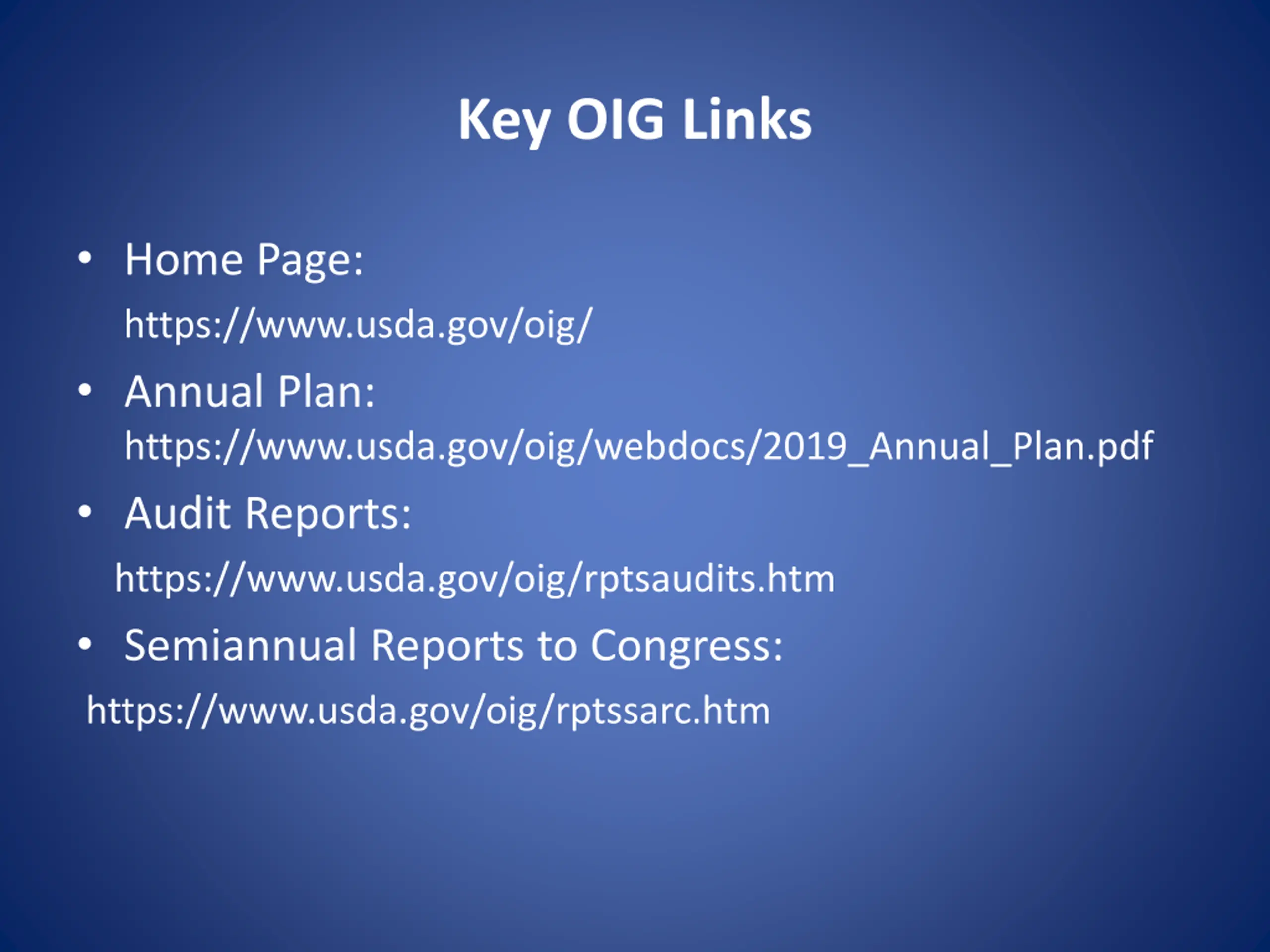 Key OIG Links Home Page: https://www.usda.gov/oig/ Annual Plan: https://www.usda.gov/oig/webdocs/2019_Annual_Plan.pdf Audit Reports: https://www.usda.gov/oig/rptsaudits.htm Semiannual Reports to Congress: https://www.usda.gov/oig/rptssarc.htm