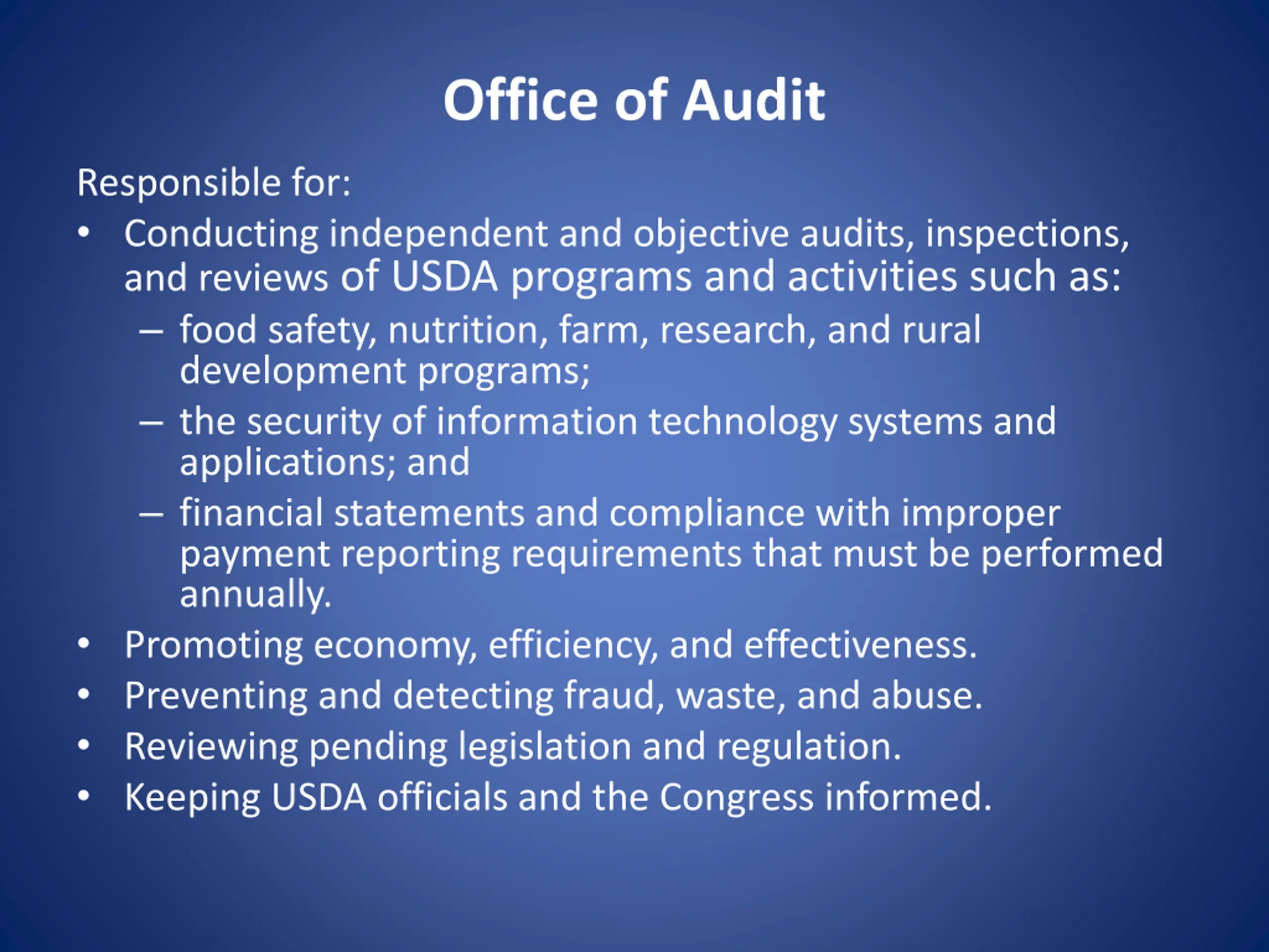 Office of Audit Responsible for: Conducting independent and objective audits, inspections, and reviews of USDA programs and activities such as: food safety, nutrition, farm, research, and rural development programs; the security of information technology systems and applications; and financial statements and compliance with improper payment reporting requirements that must be performed annually. Promoting economy, efficiency, and effectiveness. Preventing and detecting fraud, waste, and abuse. Reviewing pending legislation and regulation. Keeping USDA officials and the Congress informed.